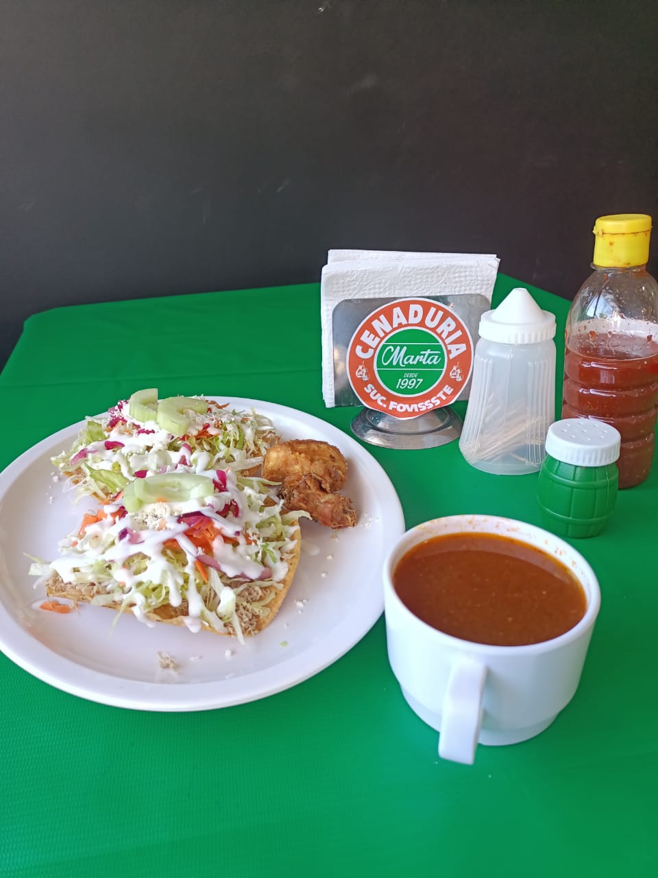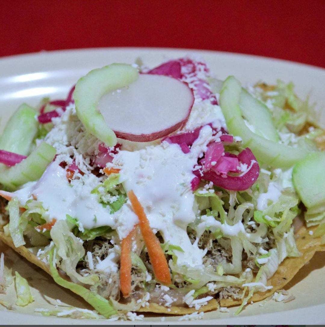 tostada, tostada tortilla de nixtamal semi frita , en una cama de frijol con res , coronada por una ensalada de la casa ( lechuga , zanahoria , cebolla , pepino , queso y crema el rábano es por temporada. acompañada de el consomé que nos ha distinguido