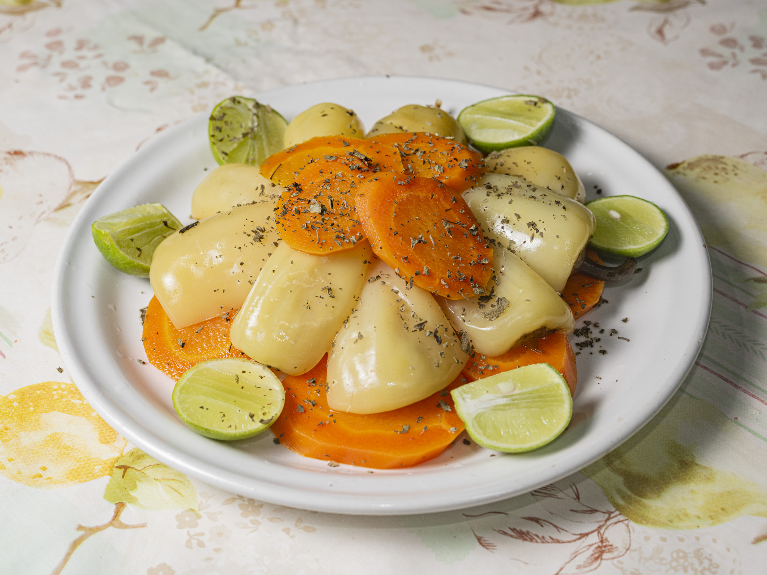 asado de res , asado de res con papitas semi fritas , ensalada de la casa ( lechuga , zanahoria , cebilla , pepino , rabano de temporada ) queso crema a escoger y el consome de la casa .. ( tortillas o tostadas a escoger )