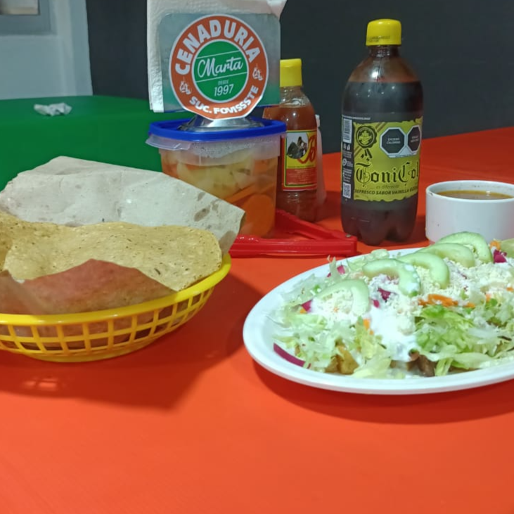 tostada de asado ( las tostadas de asado es algo que nos ha distinguido mucho , llevan carne de res con papa en cuadritos en una cama de frijol , ensalada de la casa (lechuga , zanahoria , cebolla , pepino y rábano de temporada) posterior terminamos con queso y crema . consome de la casa, salsas