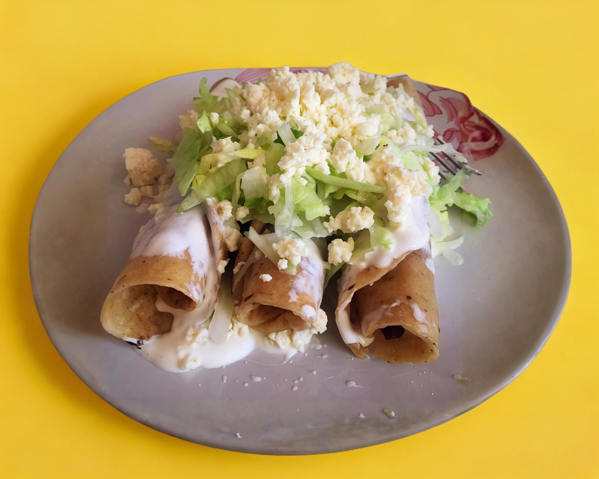 Tortilla doblada dorada, papa molida, pollo deshebrado. Encima: lechuga, zanahoria, cebolla, pepino, crema y queso.