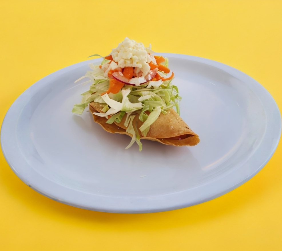 Tortilla doblada dorada, papa molida, carne de res deshebrada. Encima: lechuga, zanahoria, cebolla, pepino, crema y queso.