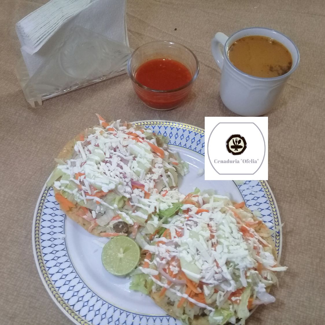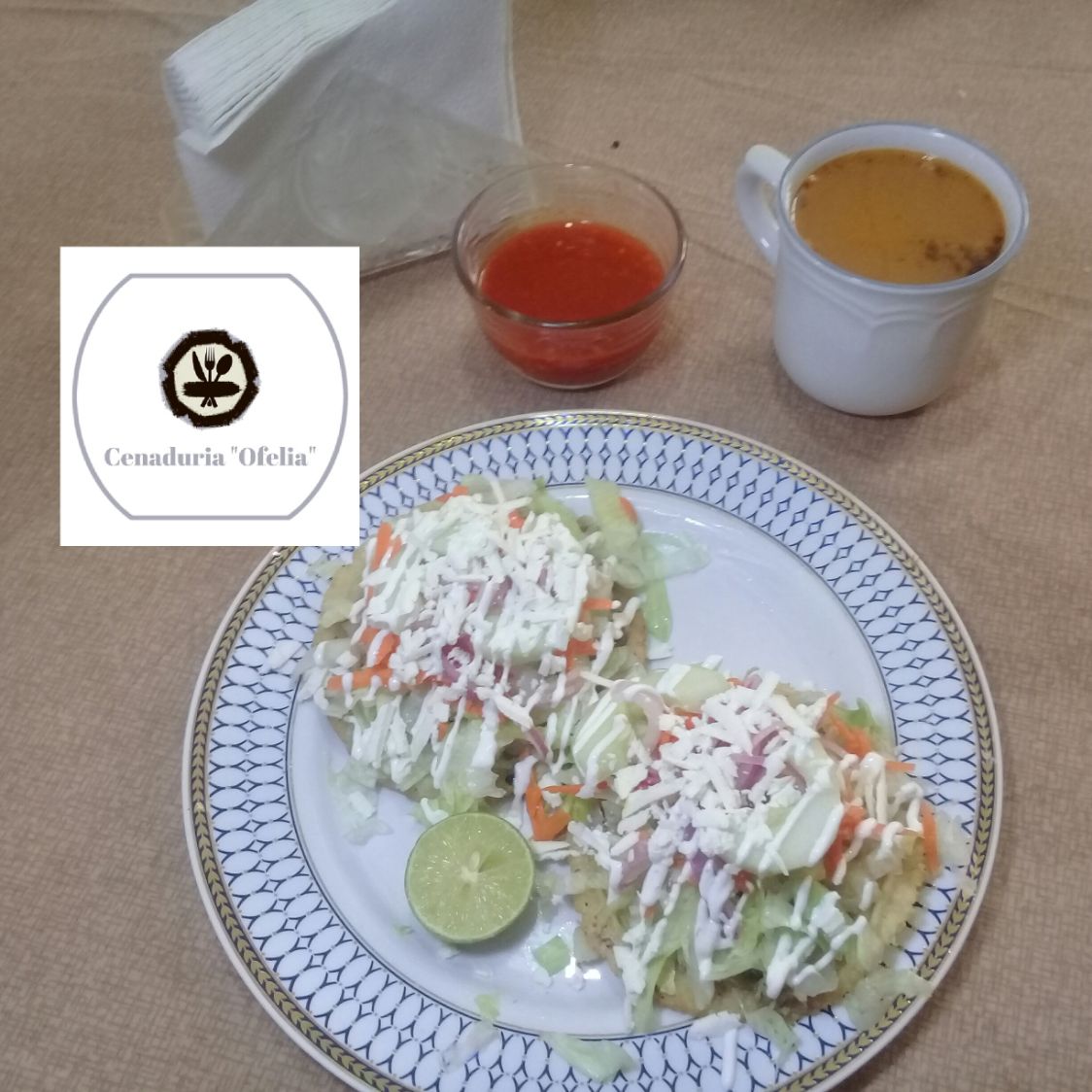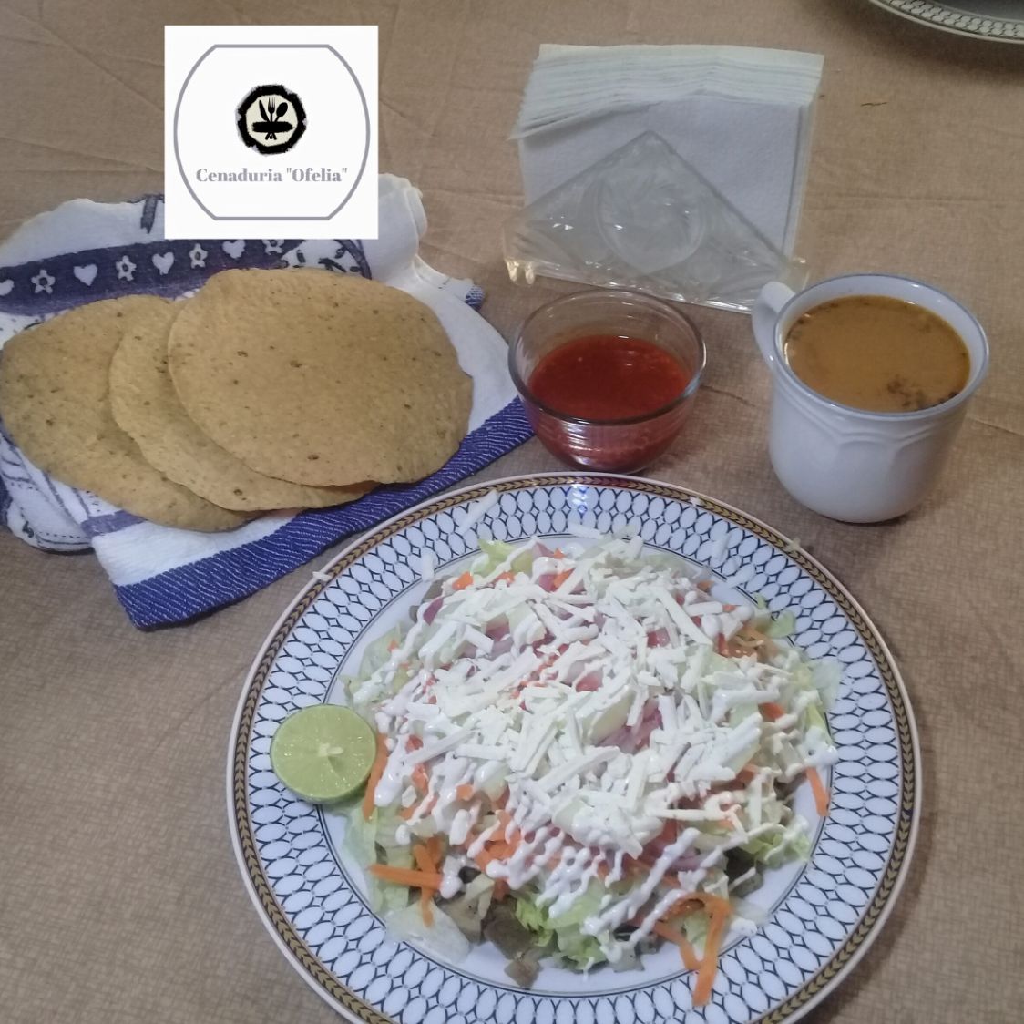 Tortilla de maíz dorada, acompañada de frijol, carne de res y verdura lechuga, zanahoria, pepino y cebolla.