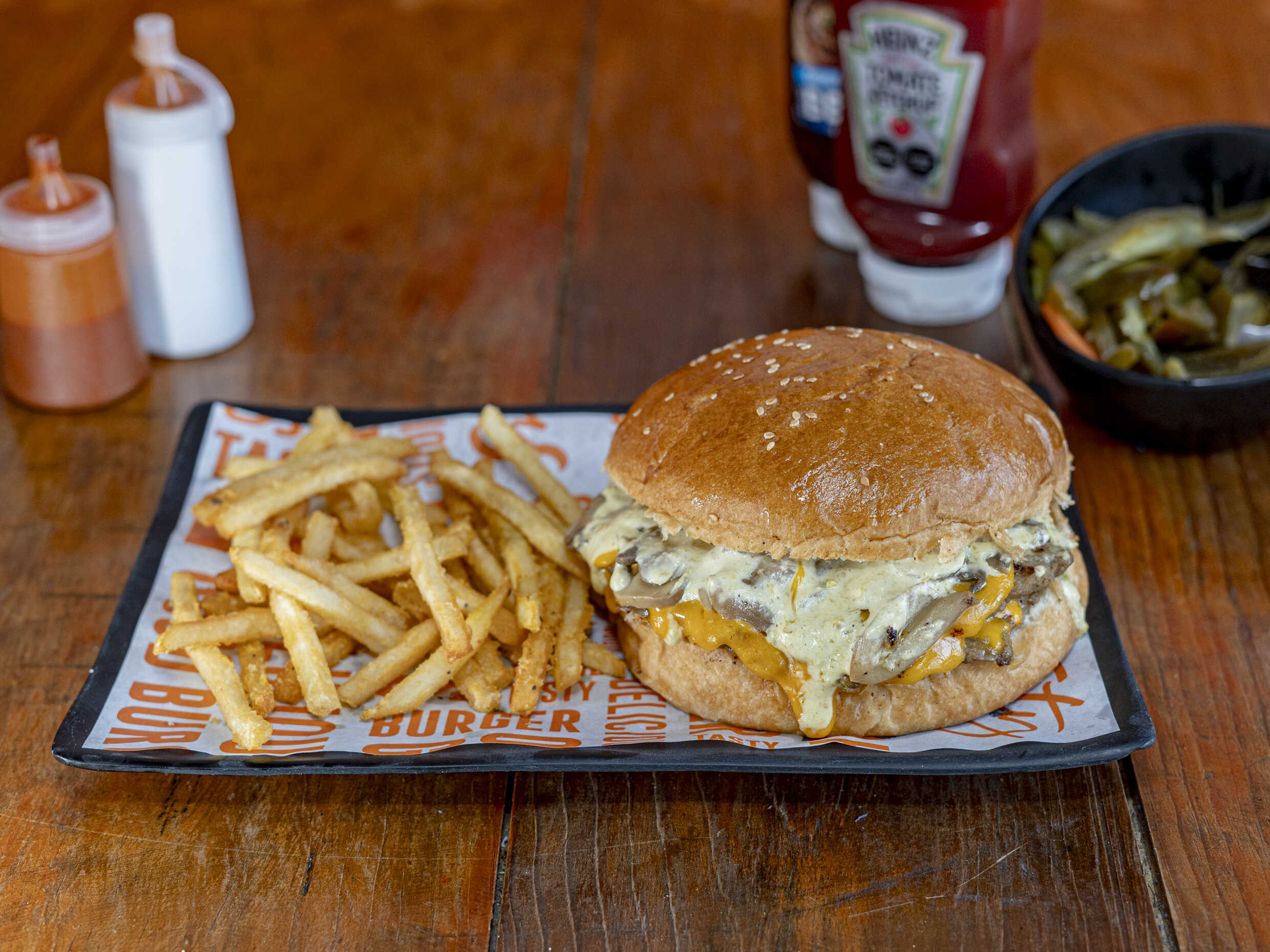 Pan brioche, seleccionada carne de res, guiso de champiñón con cebolla y queso asadero, rebanada de tomate perón, lechuga italiana, mayonesa y porción individual de papas a la francesa.