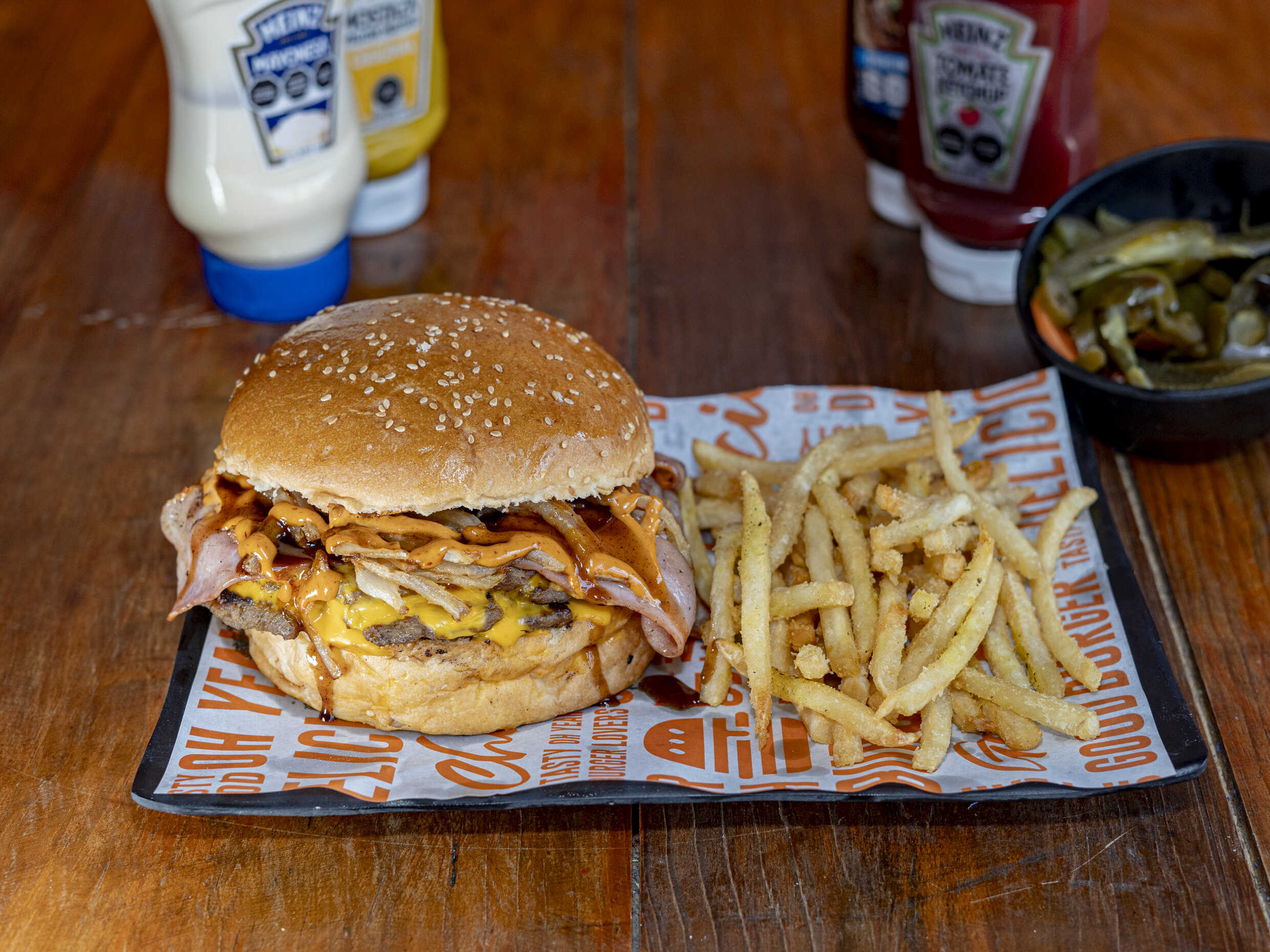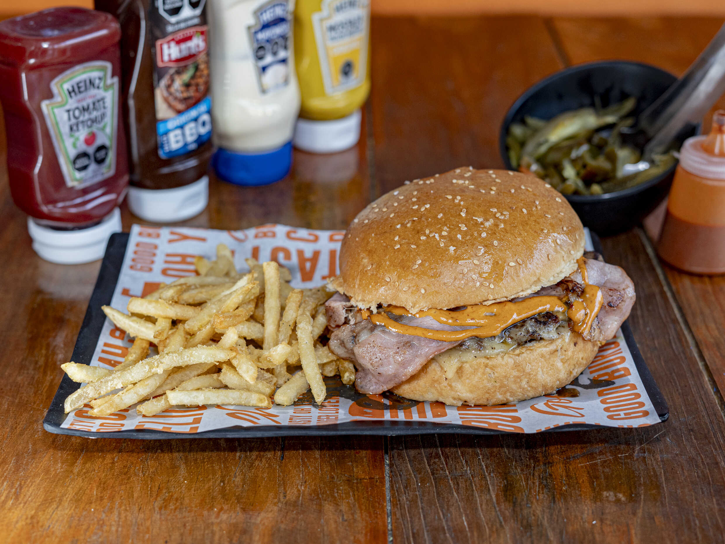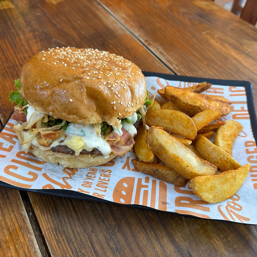 Pan brioche, selecta carne de res a la parrilla, tocino en tiras, aros de cebolla empanizado, queso amarillo líquido, rebanada de tomate perón, lechuga italiana, pan liso y porción individual de papas a la francesa.