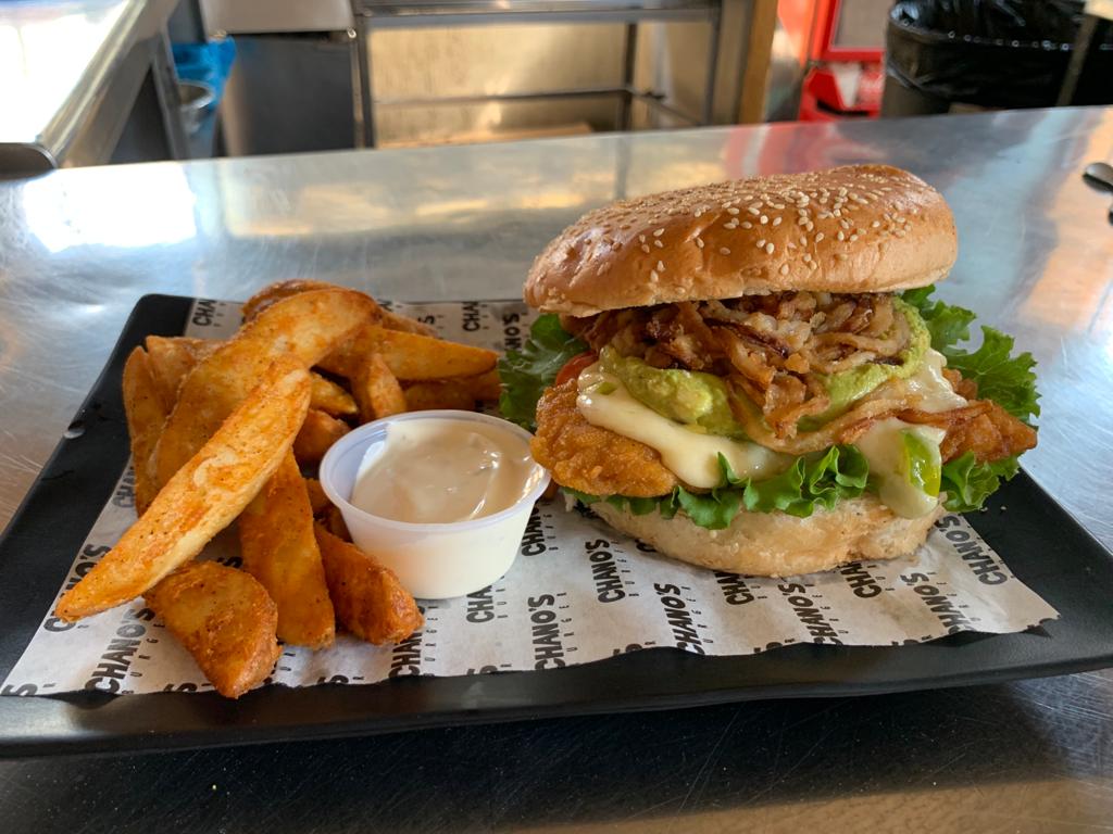 Pan brioche, camarón fresco empanizado, queso asadero fundido con chile morrón verde, lechuga italiana, poro frito, rebanada de tomate perón, aderezo Chanos, guacamole especial y porción individual de papas gajo.