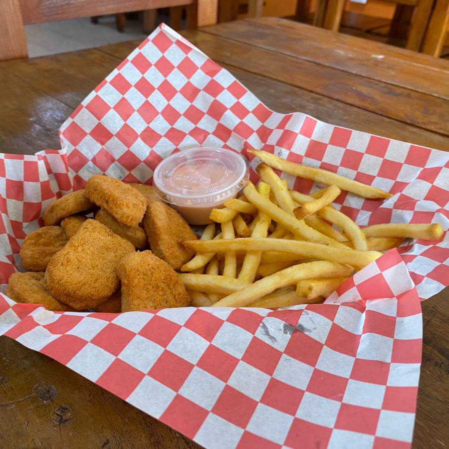 200 g De ricas de pollo empanizado, con porción individual de papas a la francesa, acompañados de aderezo dulce y jalapeño.