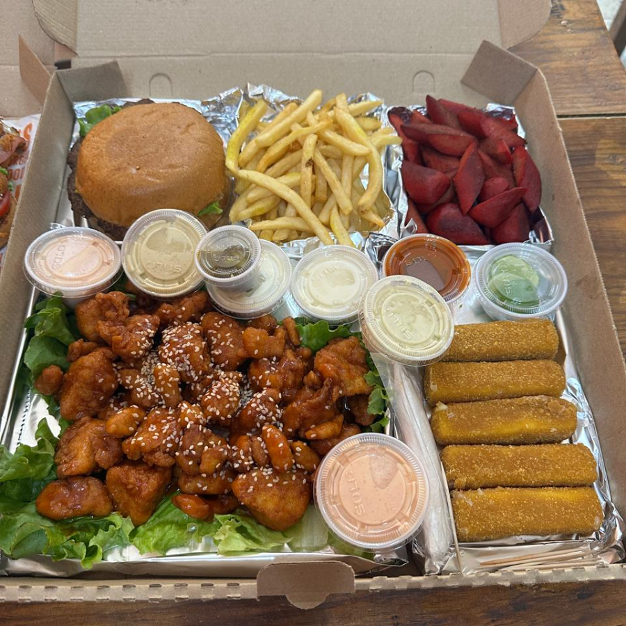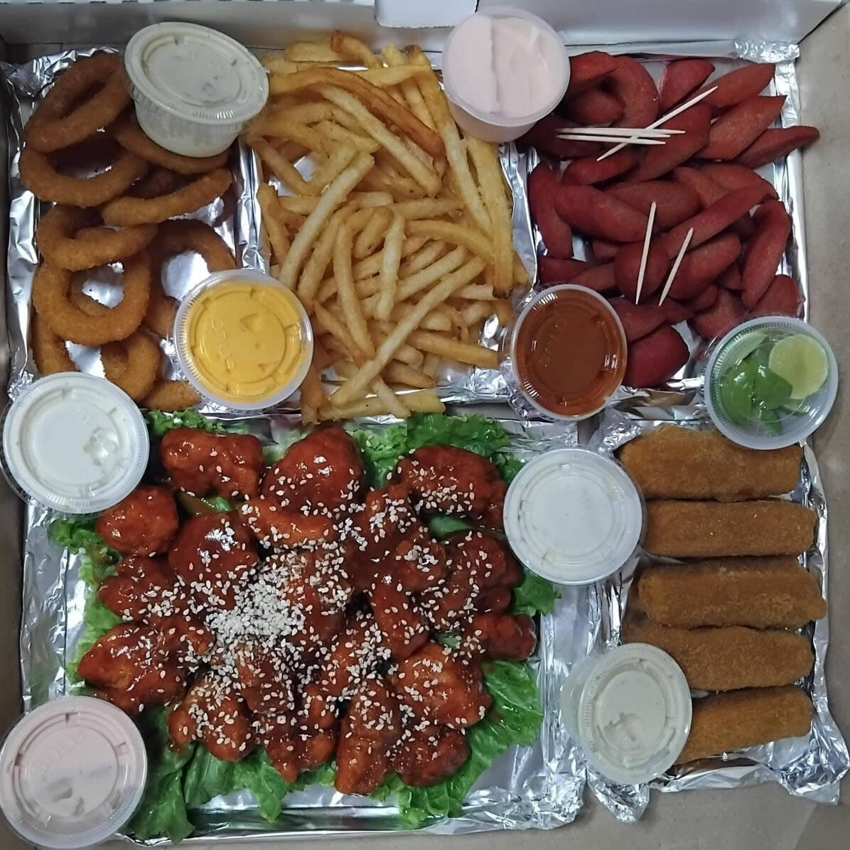 Deliciosa charola, incluye: aros de cebolla, papas a las francesas, salchichas rojas para asar, dedos de quesos, boneless (salsa a elegir), acompañada de aderezos de la casa.