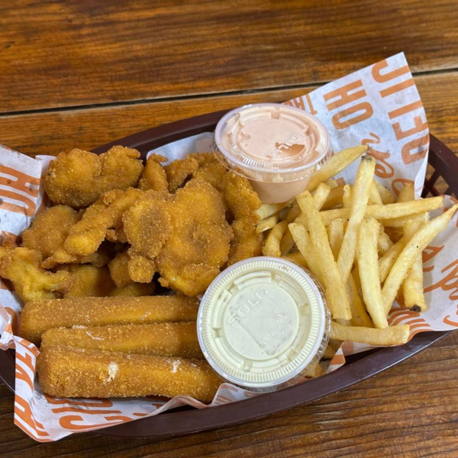 Dedos de pollo, dedos de queso, porción individual de papas a la francesa, acompañadas de aderezo dulce y jalapeño.