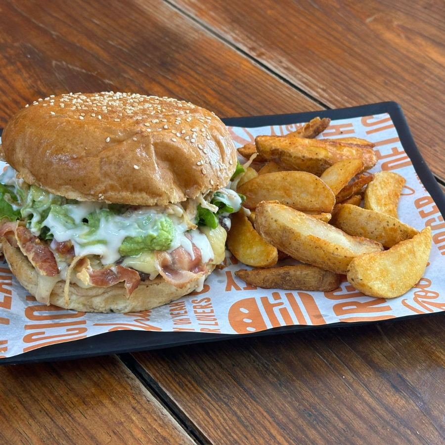 Pan brioche, selecta carne de res con queso asadero al centro, lechuga italiana, rebanada de tomate perón y cebolla frita, acompañada de guacamole especial, tocino y porción individual de papas gajo.