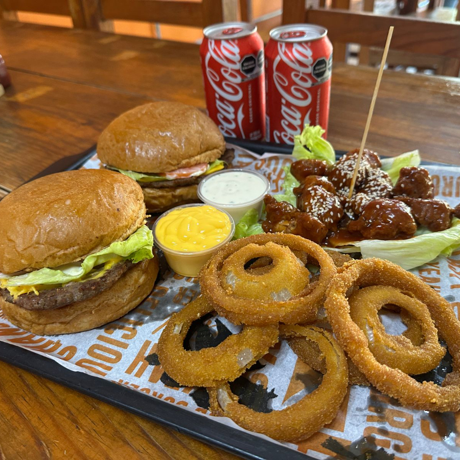 2 Hamburguesas de seleccionada carne de res con queso cheddar, orden de aros de cebolla, orden de boneless (sabor de su elección) y 2 refrescos de 355 ml en lata.