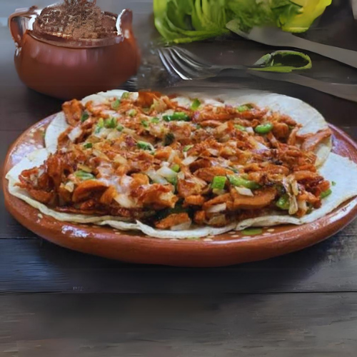 Tortilla tipo sopa de maíz de 20 cm relleno de frijol servido con nopales, además se lechuga, queso y crema o cilantro y cebolla, (rellena del guiso de su elección).