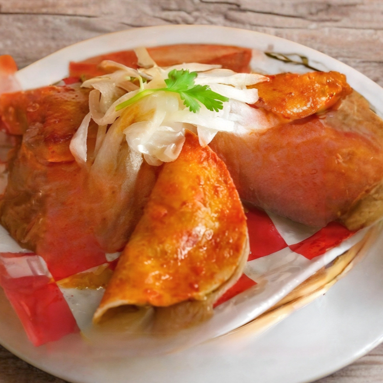 Pan telera bañada en salsa de la casa, servido con lechuga, queso fresco y crema o cilantro y cebolla, (relleno del guiso de su elección).