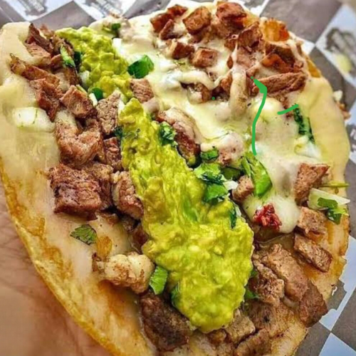 Bolita de masa de maíz nixtamal de 25 cm servido con lechuga, queso y crema o cilantro y cebolla (relleno del guiso de elección).