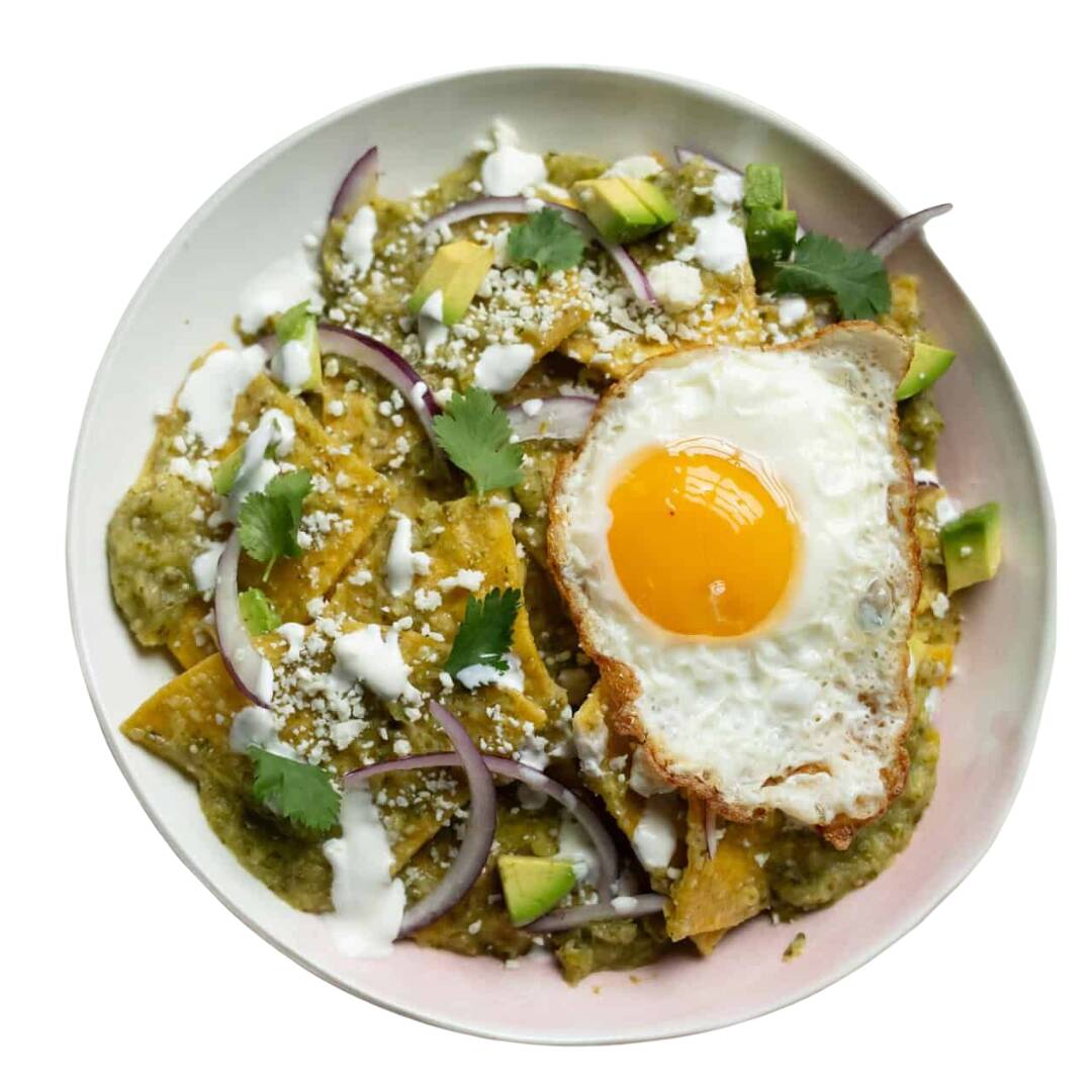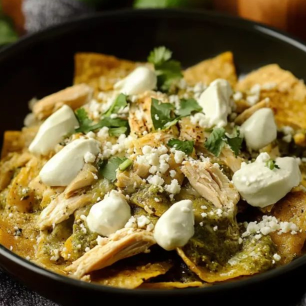 Totopos crujientes bañados en una salsa verde de tomatillo, con queso gratinado, crema, cebolla y un toque de cilantro fresco. Caseros, llenadores y perfectos a cualquier hora.
