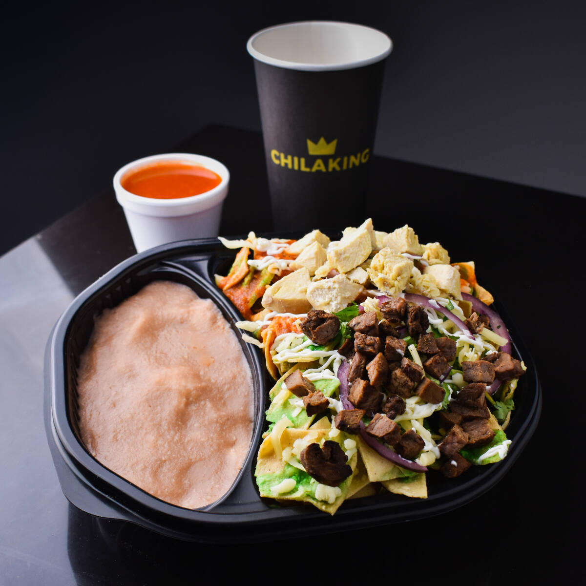 Chilaquiles bañados en salsa a elegir, con arrachera jugosa a la plancha, queso para gratinar, crema, cilantro y cebolla morada. Acompañados de frijolitos refritos.