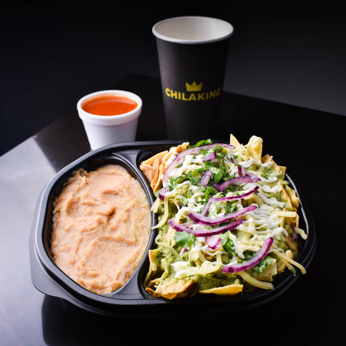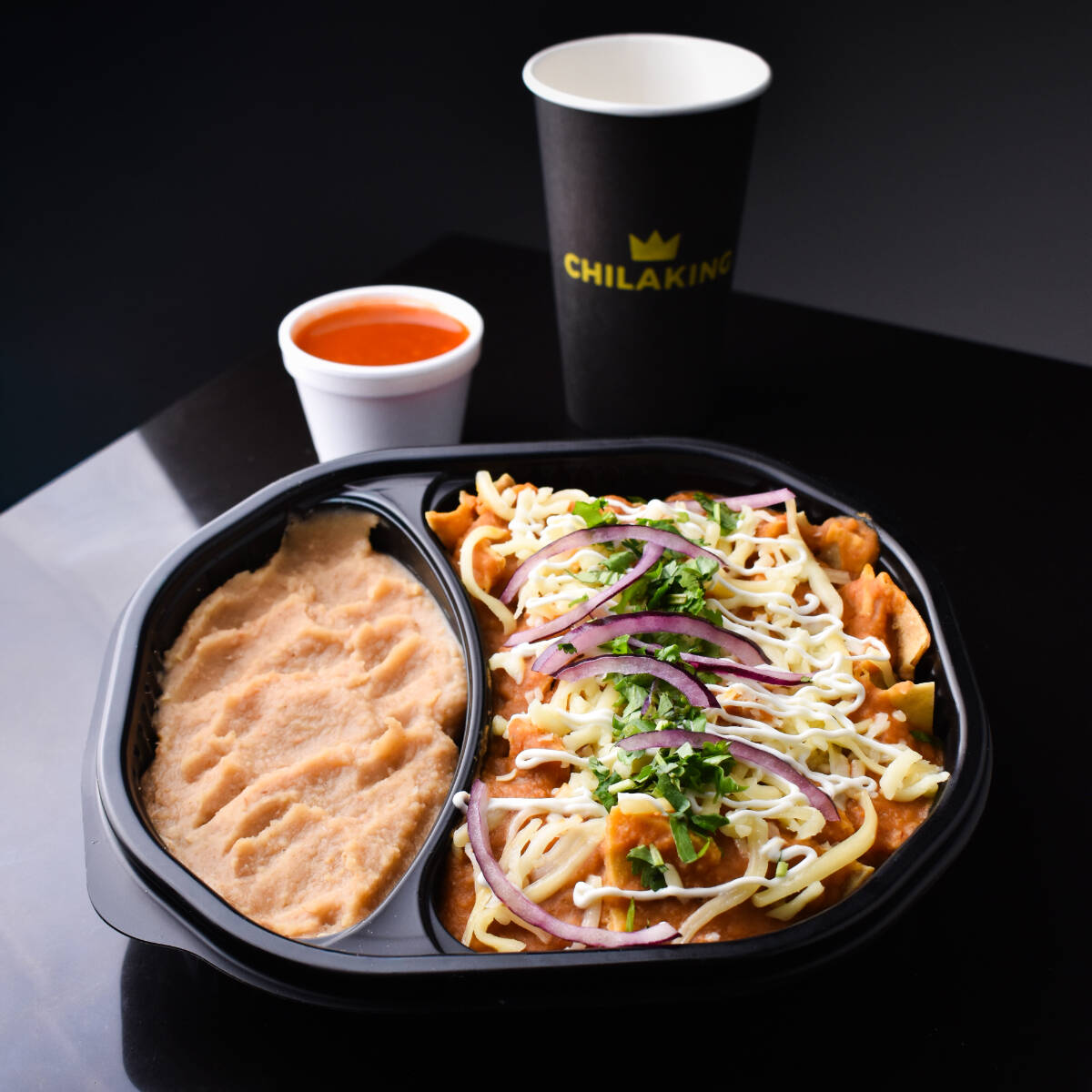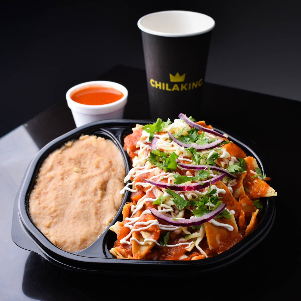 Salsa roja tradicional, balanceada y llena de sabor, con un toque de chile. Picante moderado. Incluye totopos, queso para gratinar, crema, cilantro, cebolla morada y frijolitos refritos. Imagen ilustrativa.
