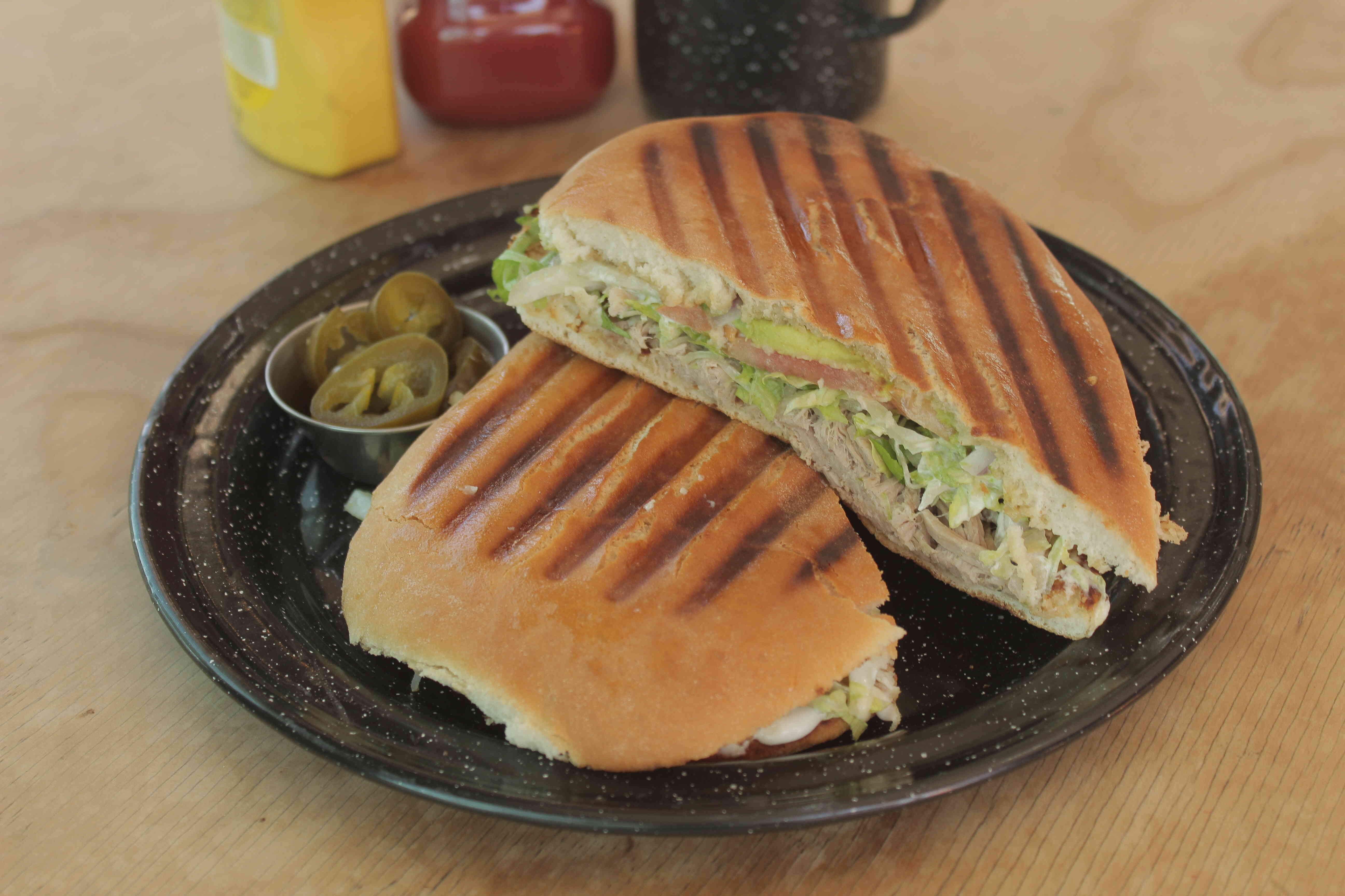 Telera con mantequilla, pierna de cerdo, tomate, aguacate, cebolla, lechuga y aderezos