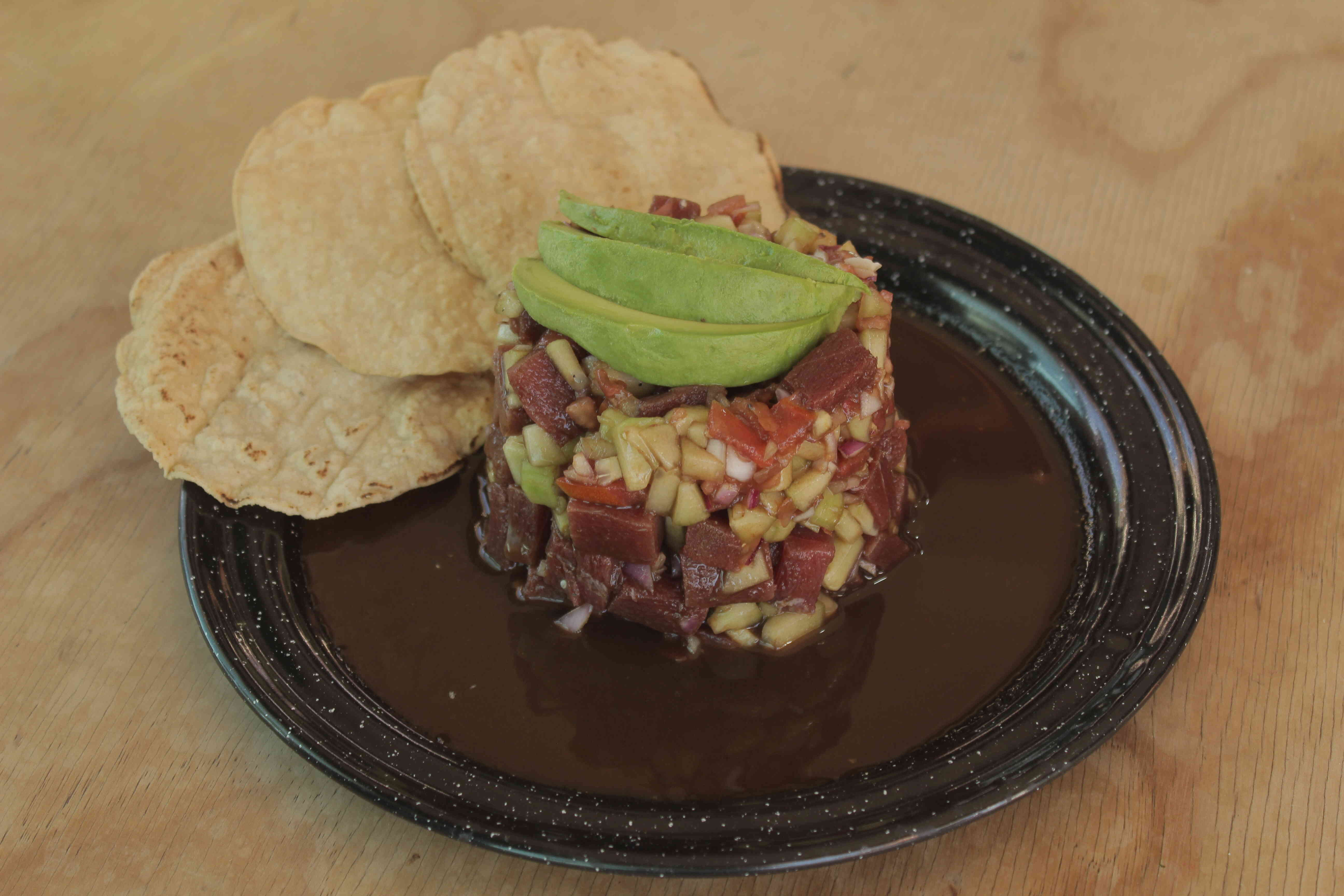 Atun crudo, pepino, tomate, cebolla, salsa soya, limon y sal