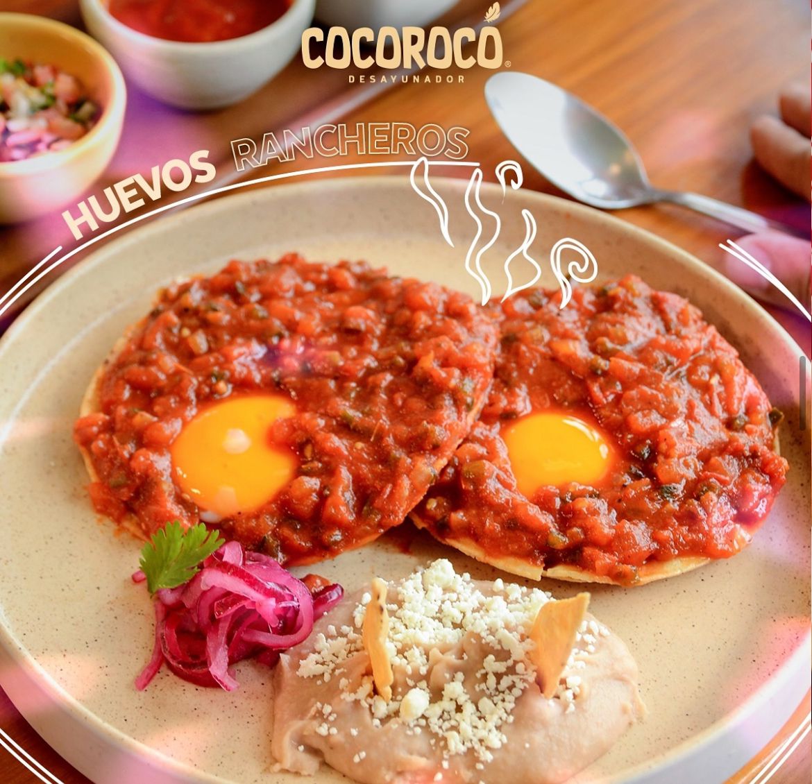 Huevos estrellados sobre tortilla dorada bañada en salsa ranchera de casa y frijol refrito.