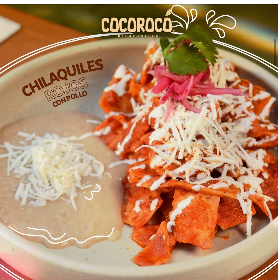 Chilaquiles con crema, queso, cebolla morada, cilantro y frijol refrito.