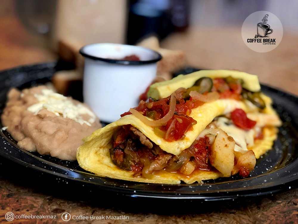 Omelette relleno de Jamón, tocino, bañado de rico queso gouda y pedazos de tocino deshidratado, acompañado de frijoles