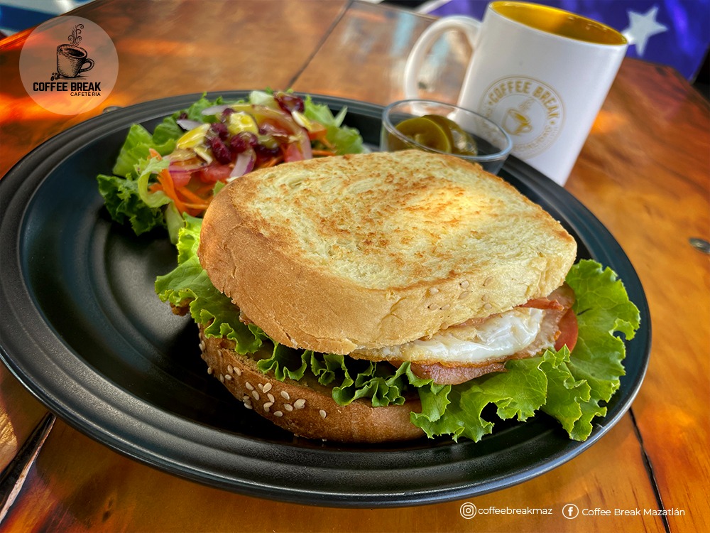 Super sándwich relleno de huevito con jamón, queso, tocino y aguacate acompañado de ensalada.