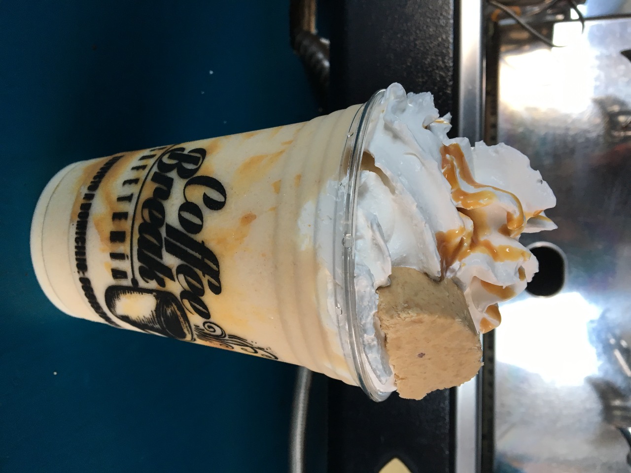 Mezcla de caramelo, espresso, leche y un copete de crema batida bebida caliente.
