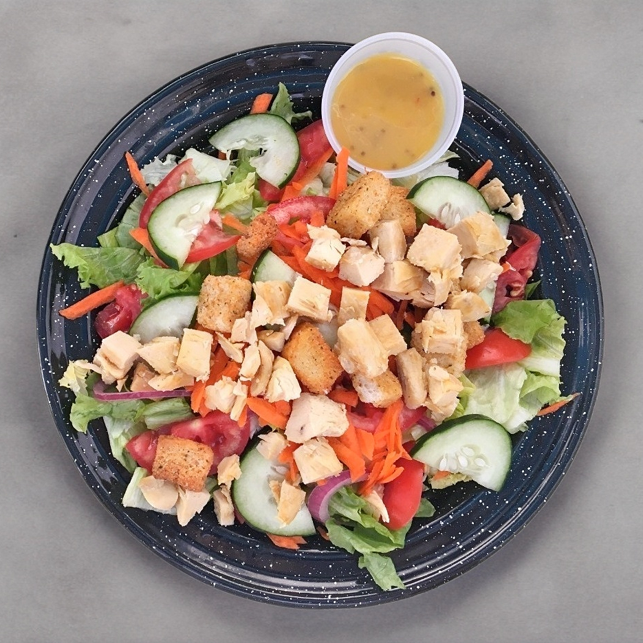 Lechuga, tomate, cebolla, zanahoria, pepino, crutones y pollo.