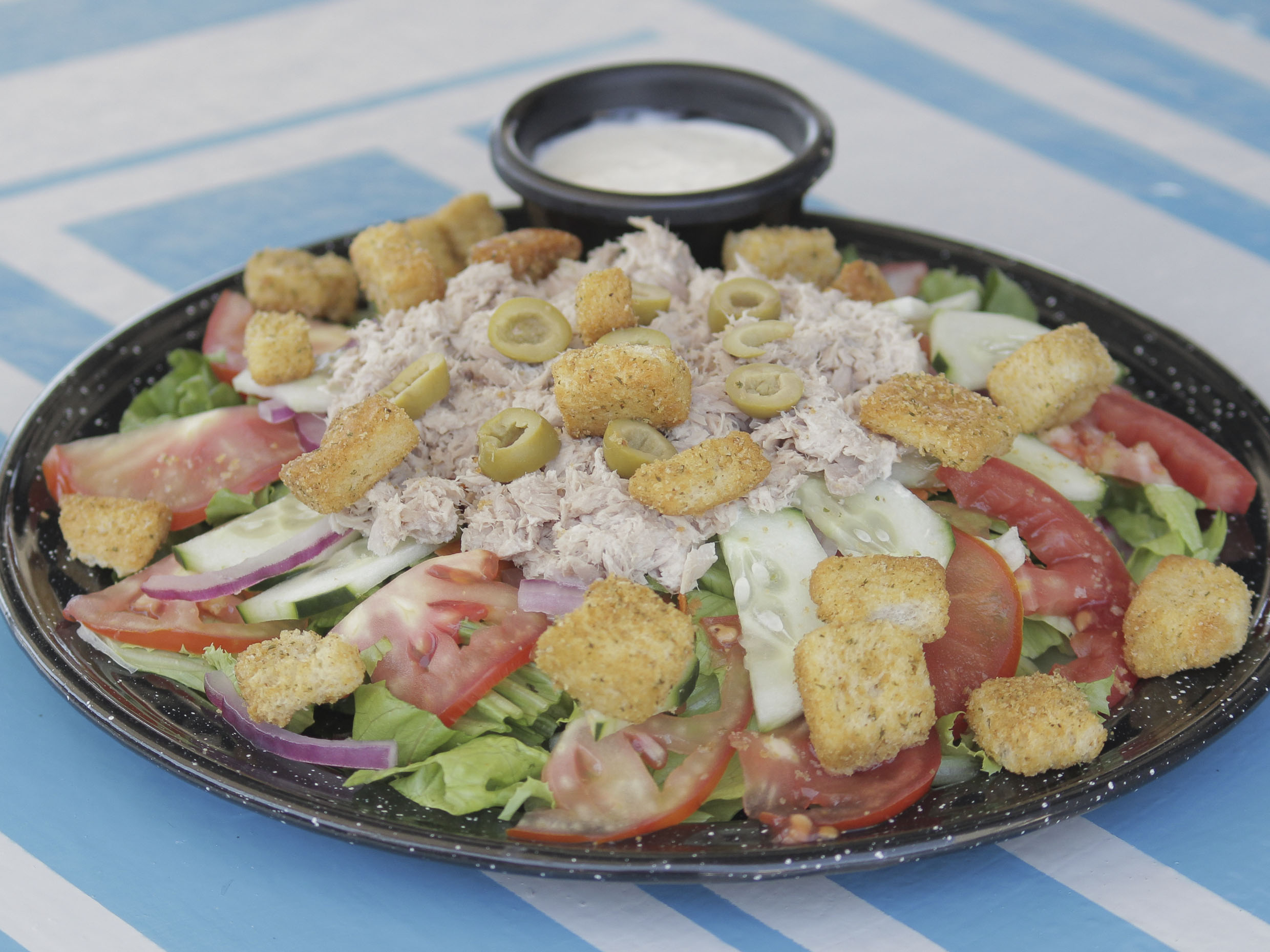Lechuga, tomate, cebolla, zanahoria, atún, pepino y crutones.