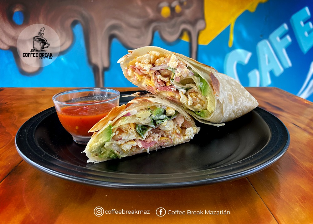 Relleno de huevo, tocino, jamón, aguacate, lechuga, cebolla y aderezo.