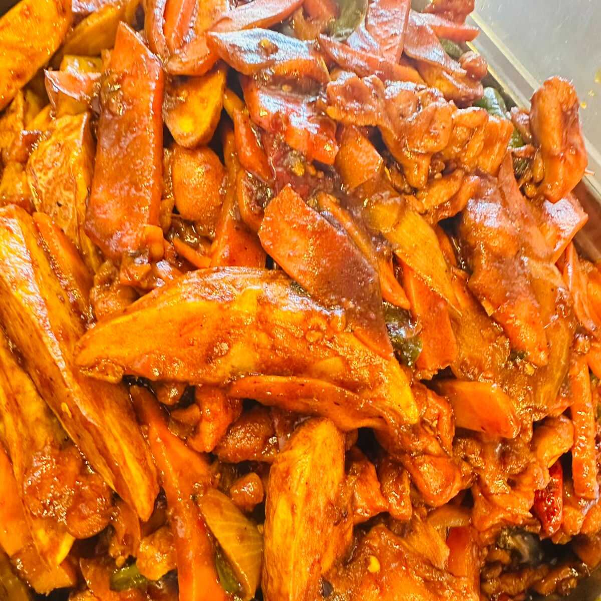 Fajitas de pollo en salsa de ostión.