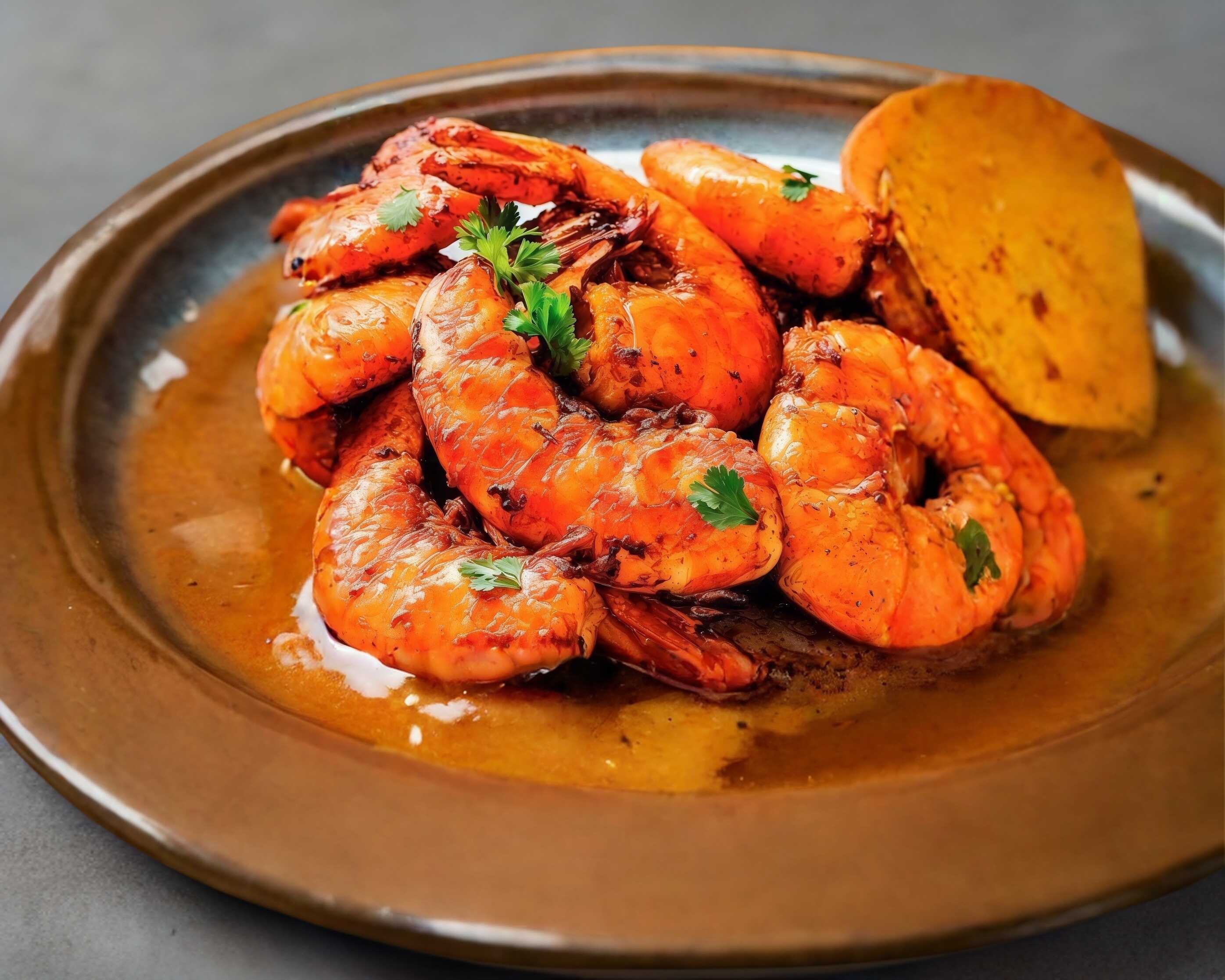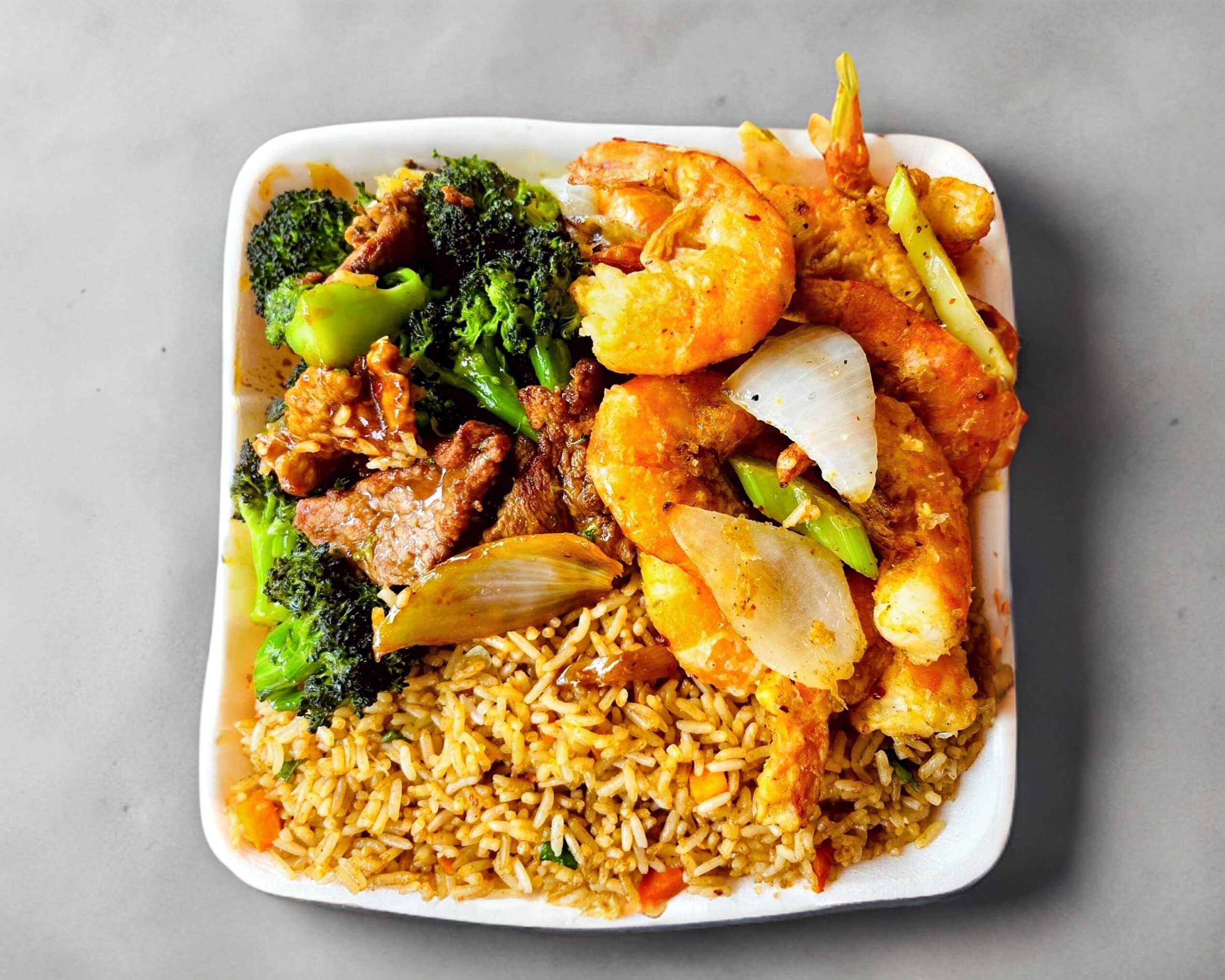 Camarón y verduras. Incluye un tazón de arroz blanco.