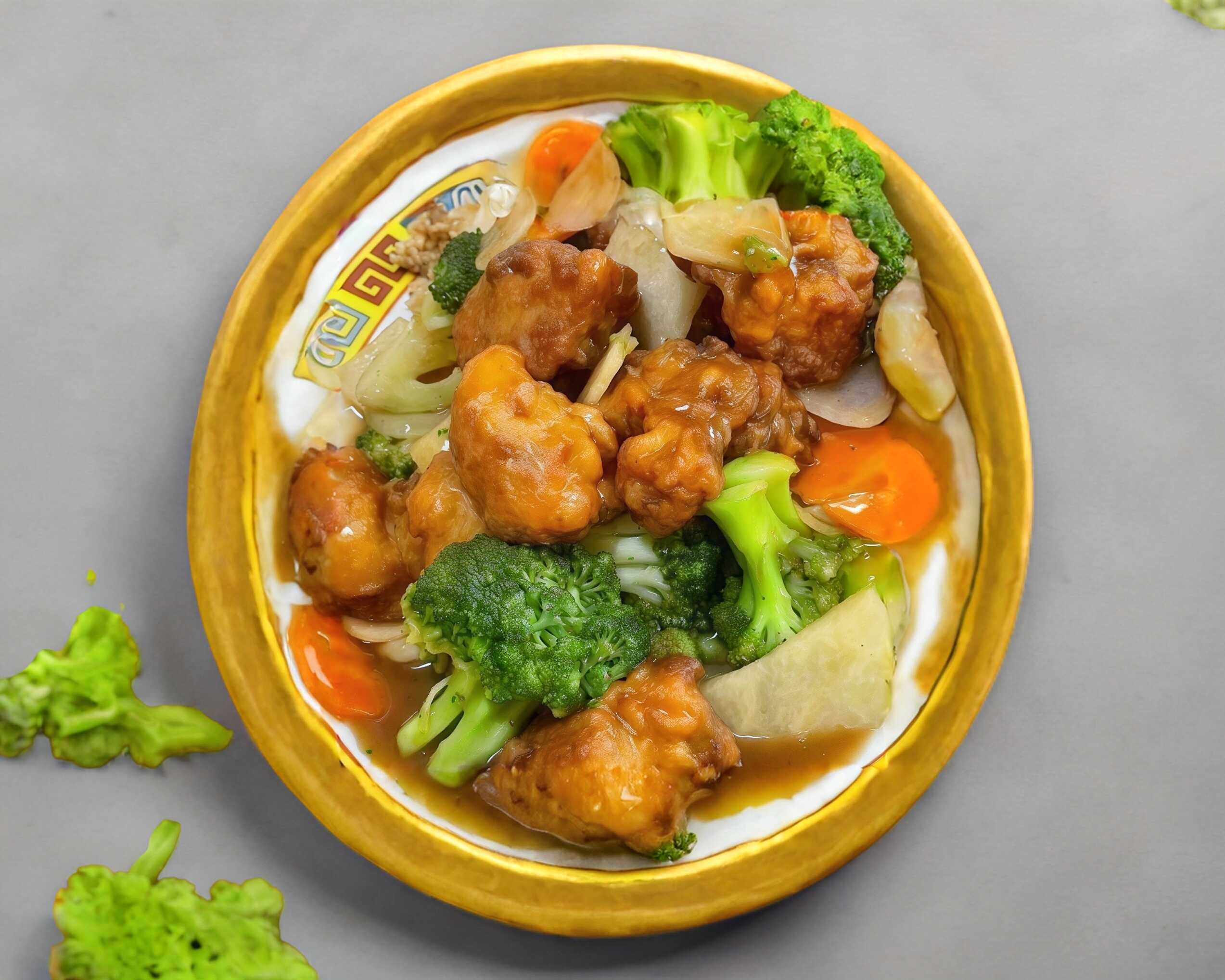 Pollo frito con salsa de naranja agridulce. 1/2