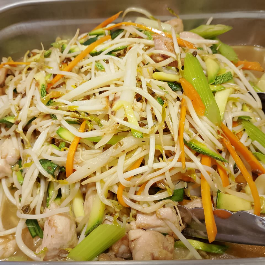 Pollo, spaghetti y verduras.