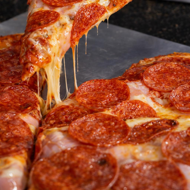 Pizza clásica con base crujiente, salsa de tomate, mozzarella fundida y pepperoni dorado al horno.