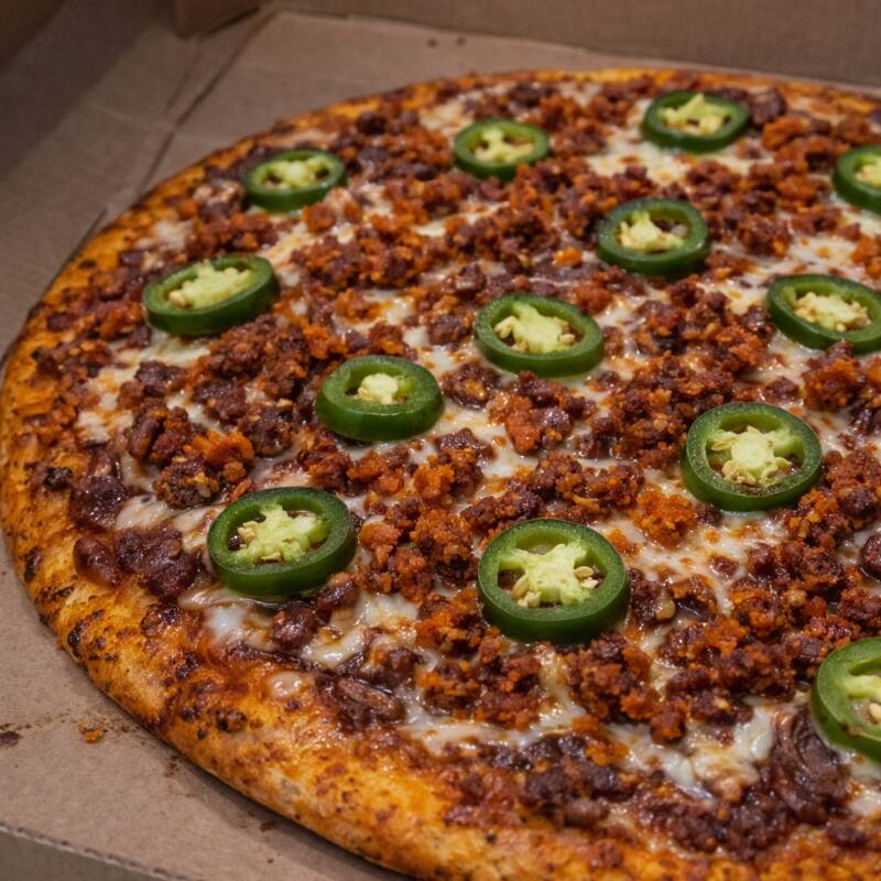 Mozzarella fundida con frijol, chorizo y jalapeño horneados sobre salsa de tomate y base crujiente al punto perfecto.