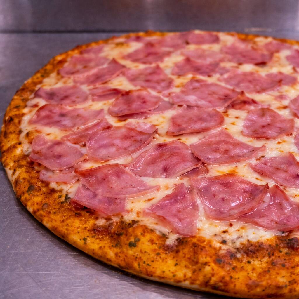 Pizza con base de tomate, mozzarella fundida y finas capas de jamón horneado a la perfección sobre una base crujiente.