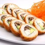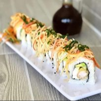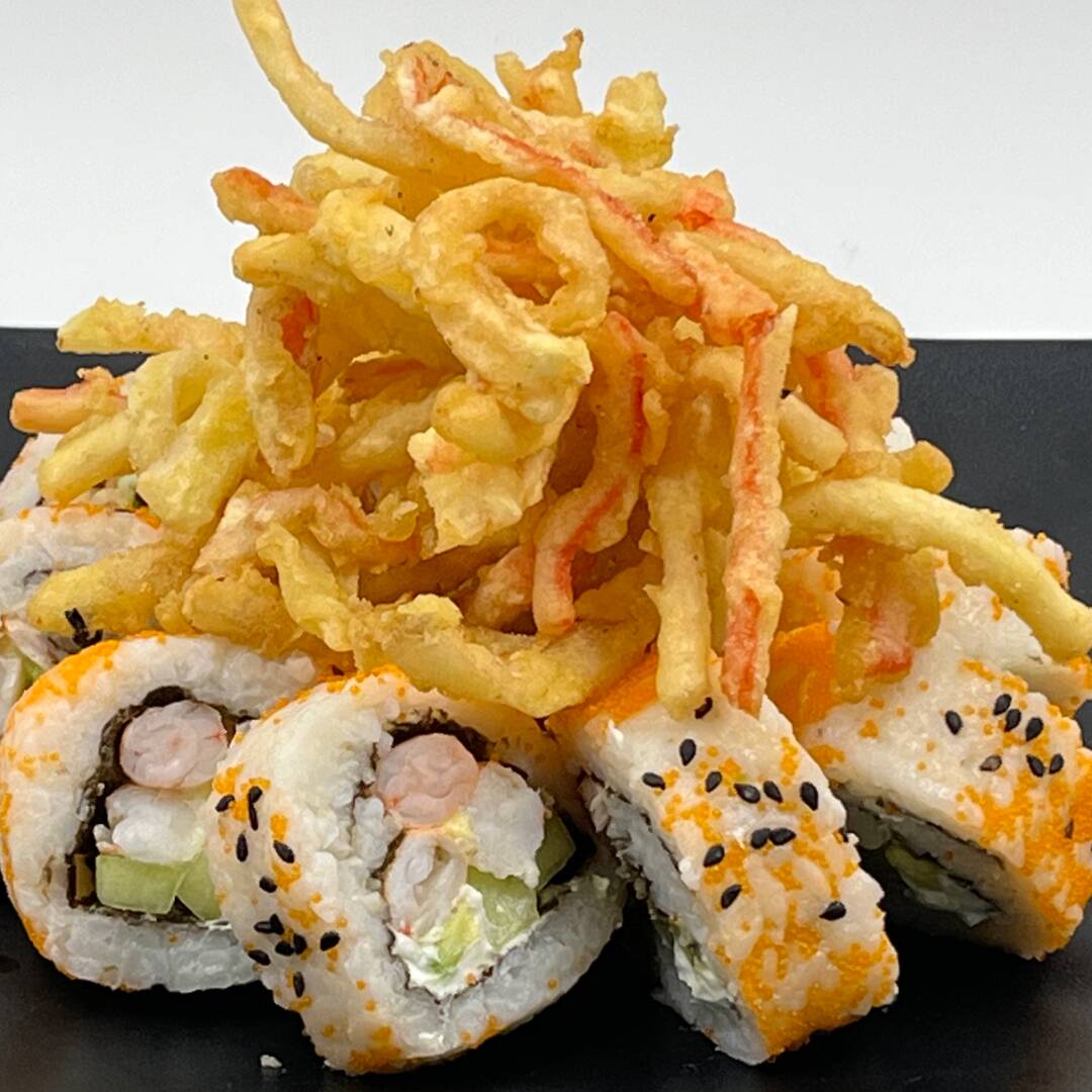 Camarón, pepino y philadelphia con aguacate, masago y ajonjolí por dentro, coronado con hojuelas de cangrejo tempura por fuera.