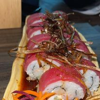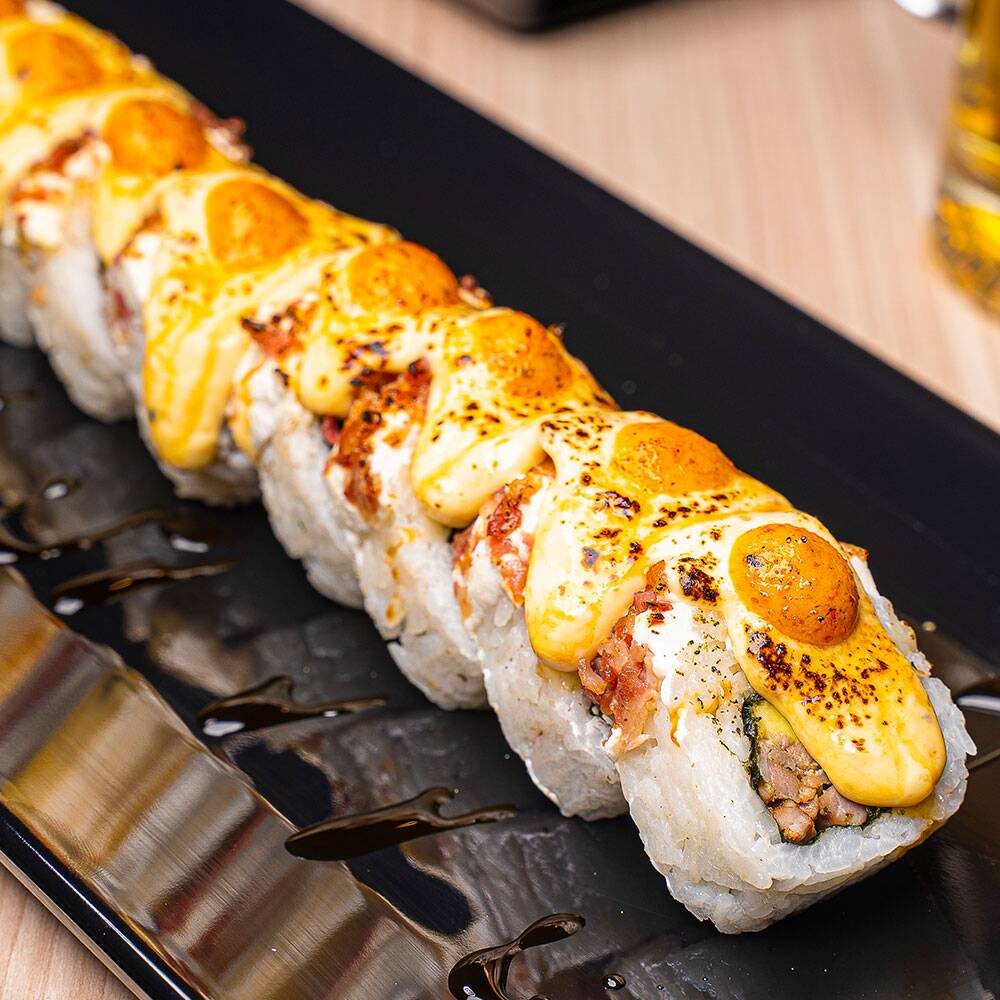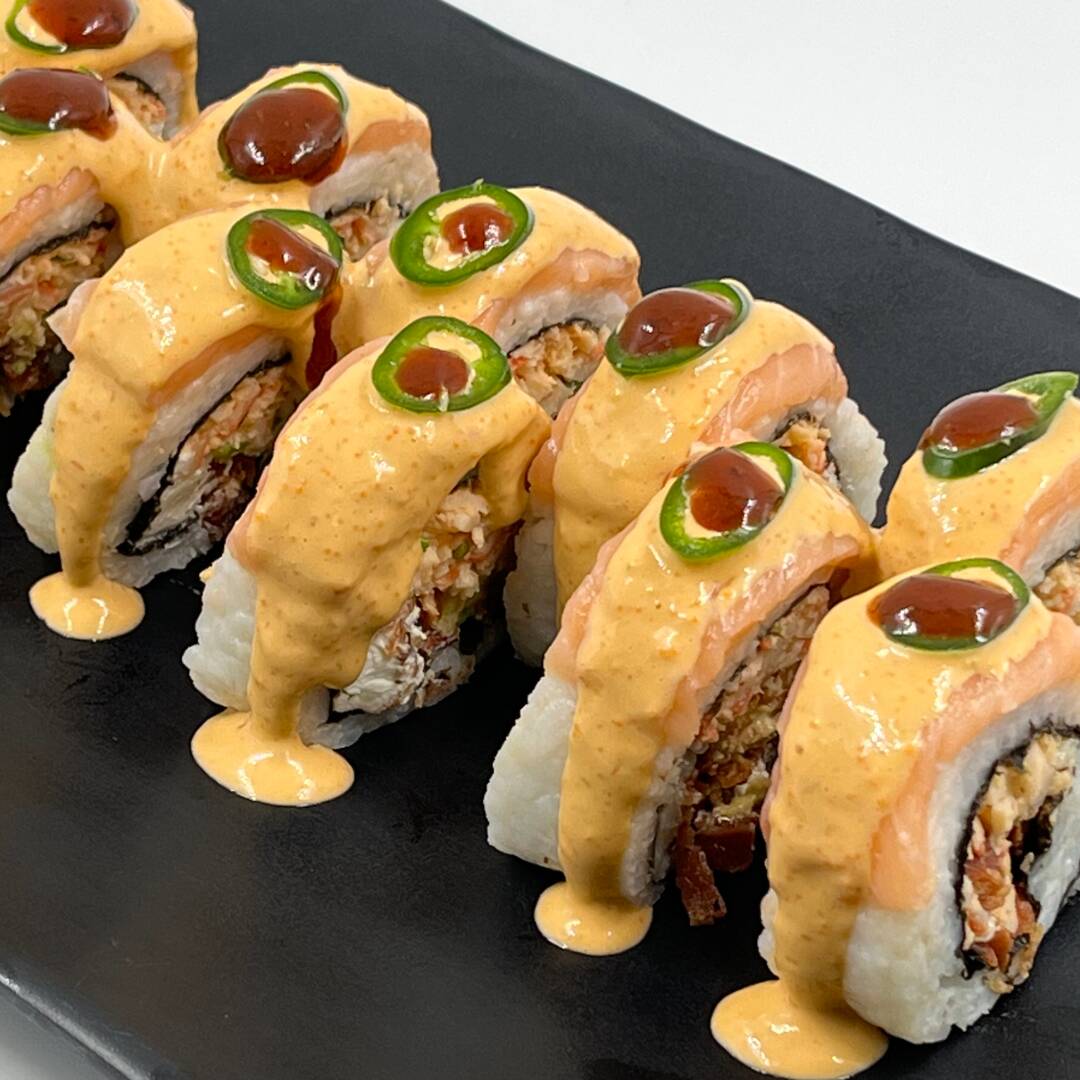 Salmón, atún, aguacate y masago por fuera, anguila ahumada, kani, pepino y philadelphia por dentro, bañado en salsa de anguila y ajonjolí tostado.