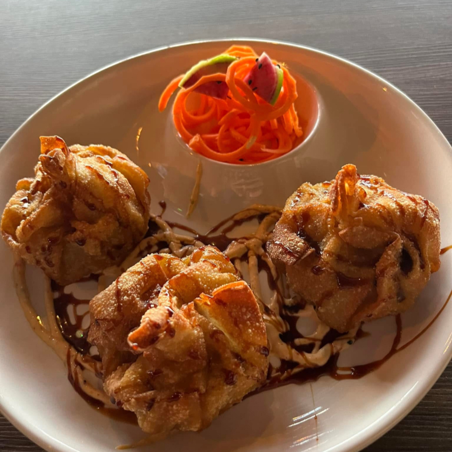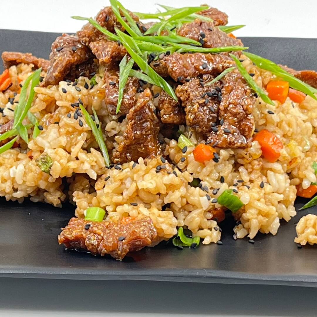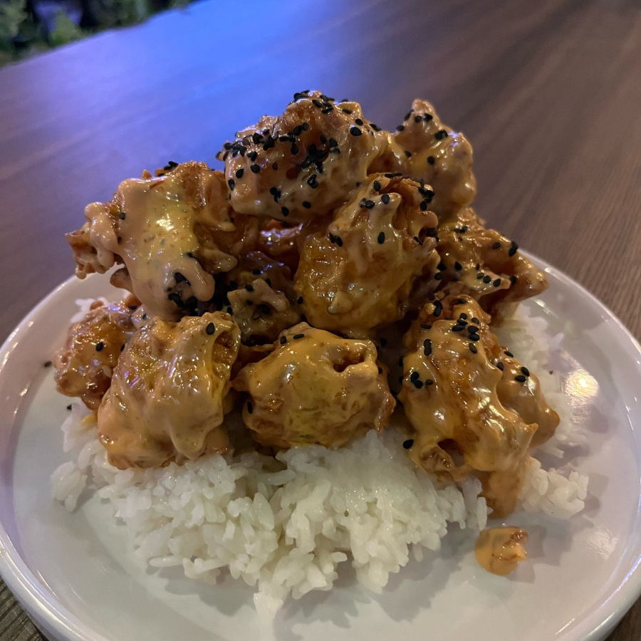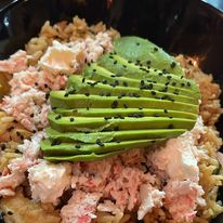 Arroz frito, camarón, philadelphia, pepino y aguacate por dentro, coronado con tampico, anguila y furikake.