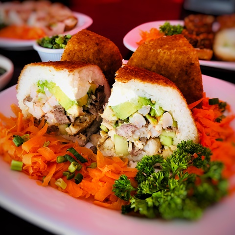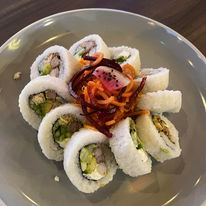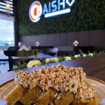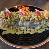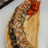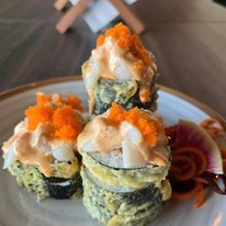 Alga por fuera, camarón empanizado, pepino, philadelphia y aguacate por dentro, coronado con callo de almeja, masago y aderezo spicy.