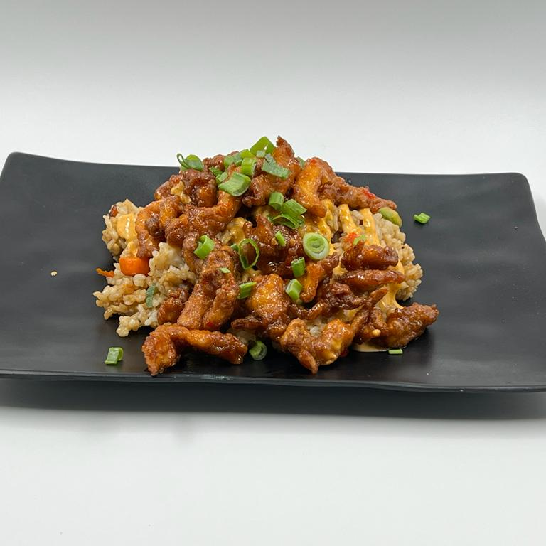 Frito con verduras, aderezo spicy y pollo agridulce.