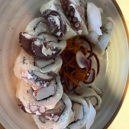 Aguacate, pepino y philadelphia por dentro con laminada por fuera, coronado con una mezcla de pulpo, callo de almeja y camarón.