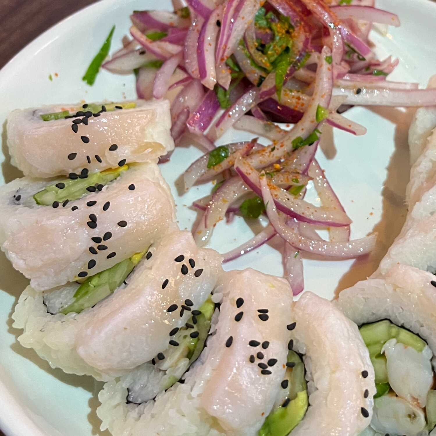 Camarón, pepino, aguacate y serrano por dentro, callo por fuera coronado con cebolla spicy.