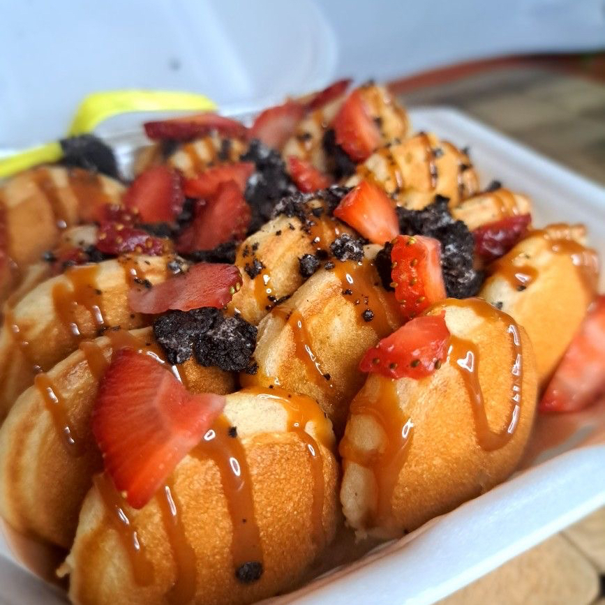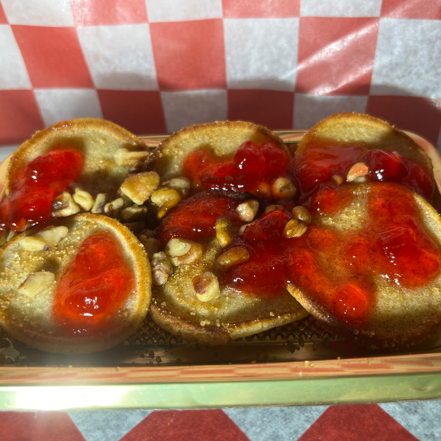 Mini hot cakes sabor churro, incluye 1 o 2 coberturas a elegir y 1 topping