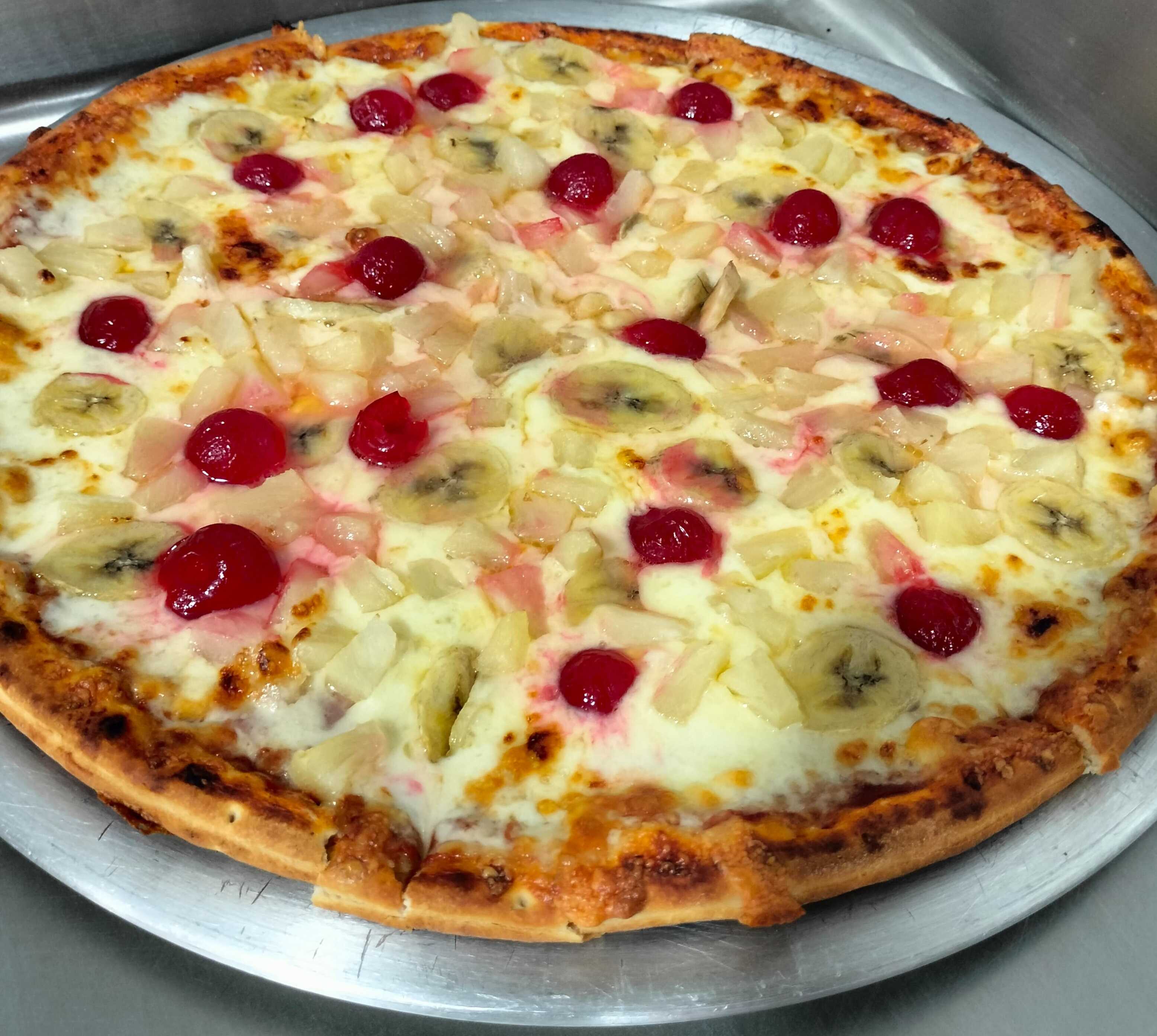 Deliciosa masa para pizza preparada artesanalmente con salsa de jitomate y queso acompañada de jamón, plátano, piña y cereza