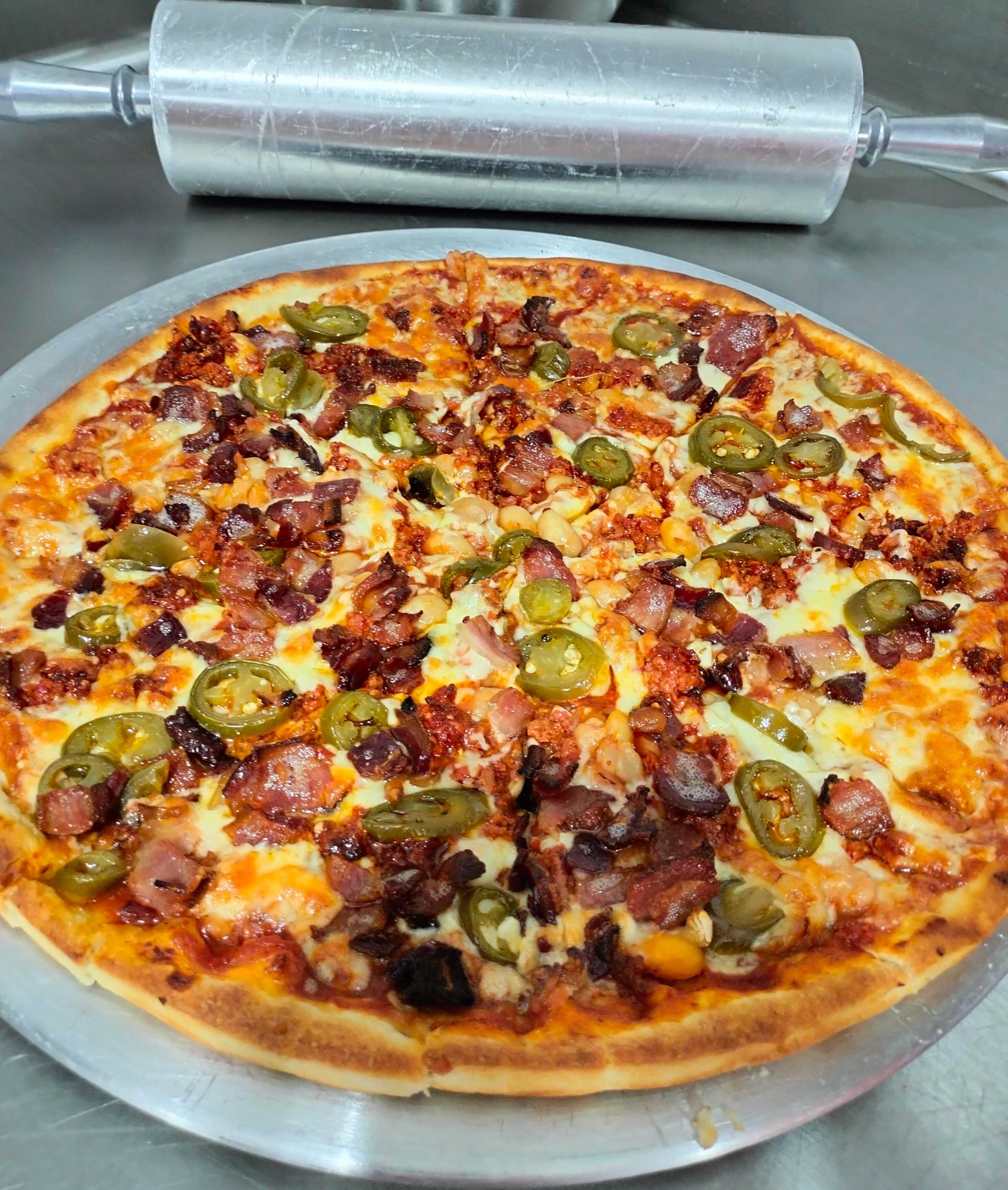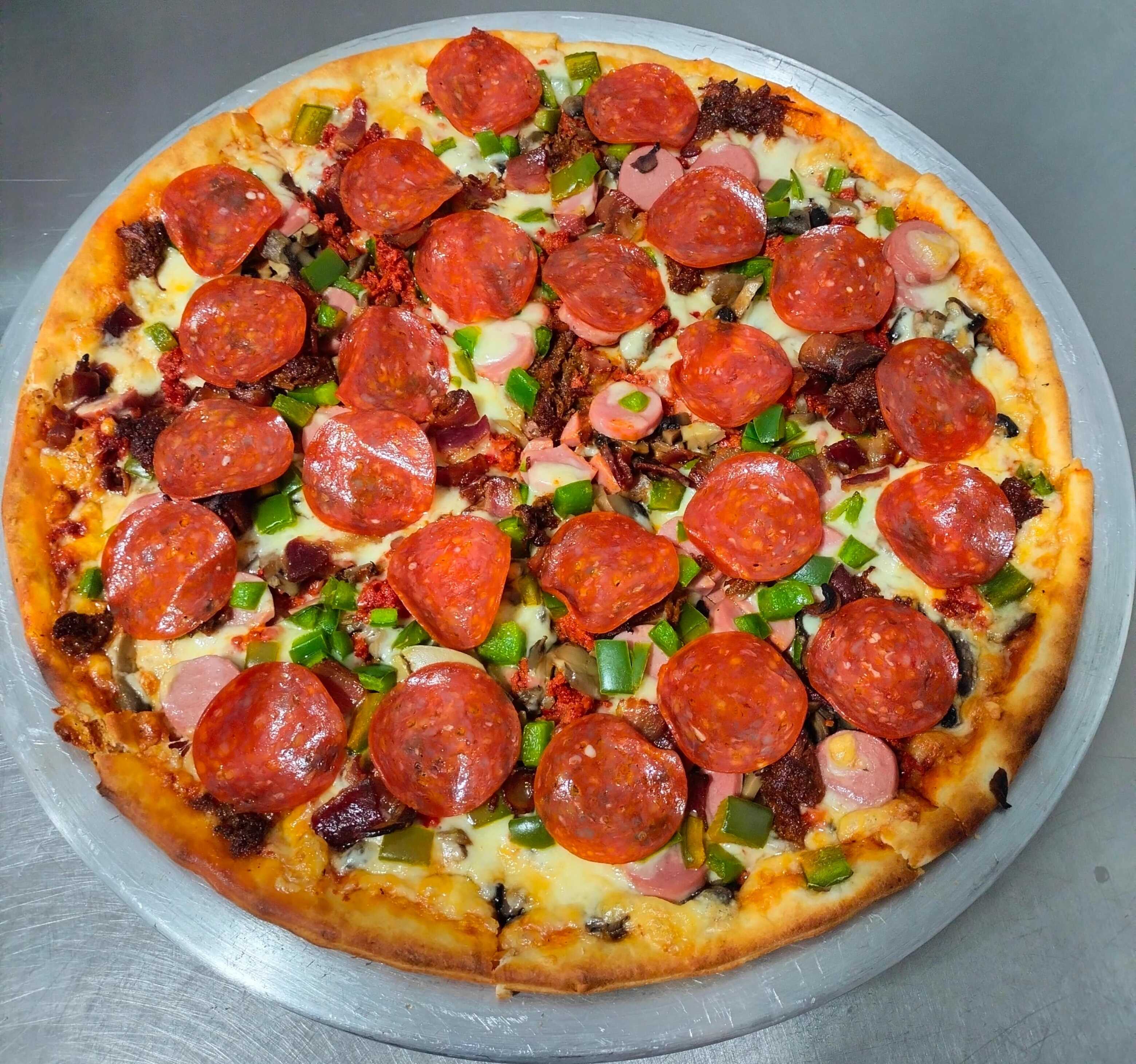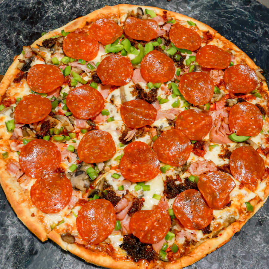 Deliciosa masa para pizza preparada artesanalmente con salsa de jitomate y queso acompañada de pepperoni, salami, jamón, chorizo, salchicha, tocino, chilorio, champiñones y pimiento verde