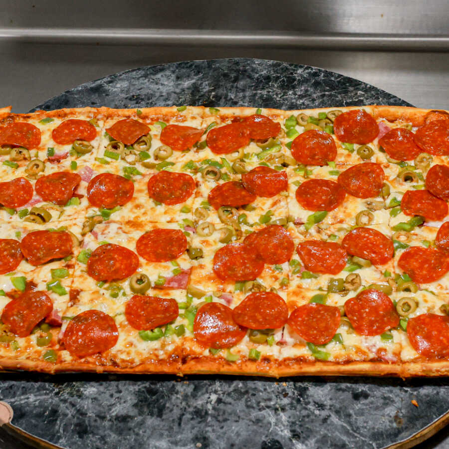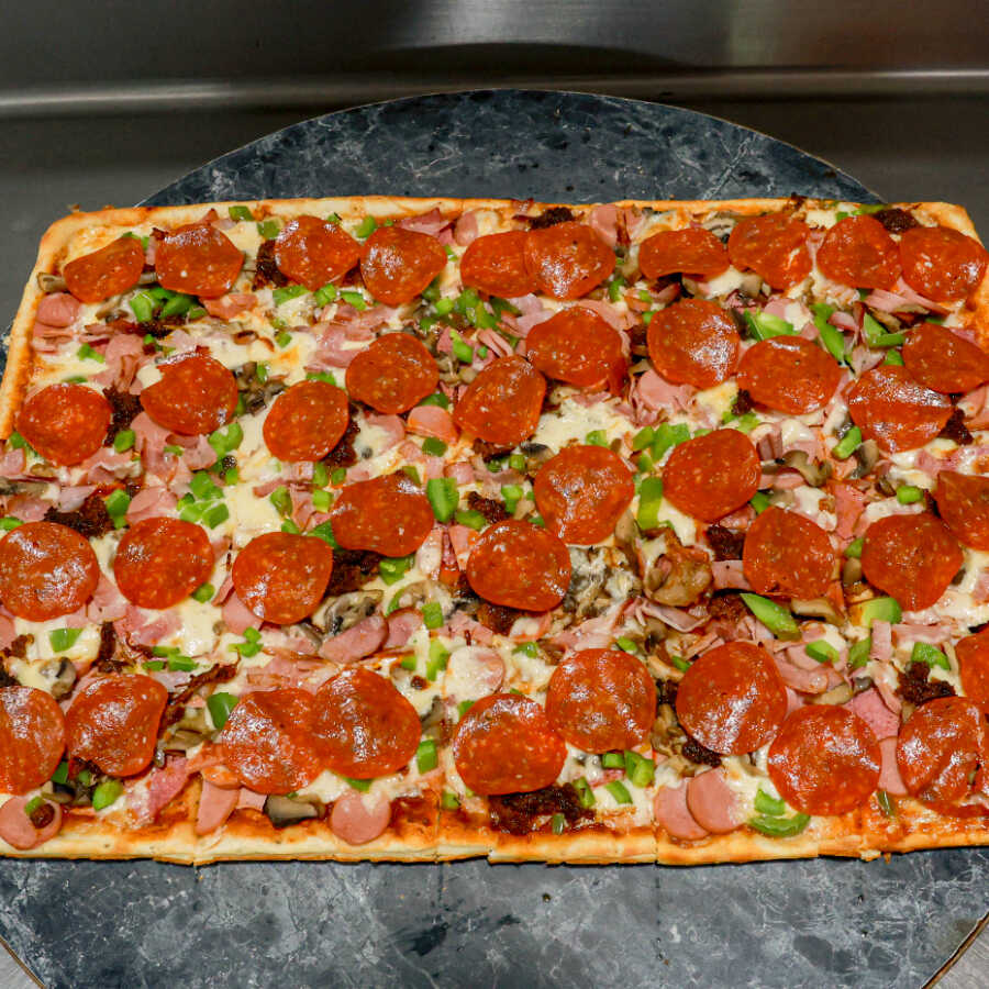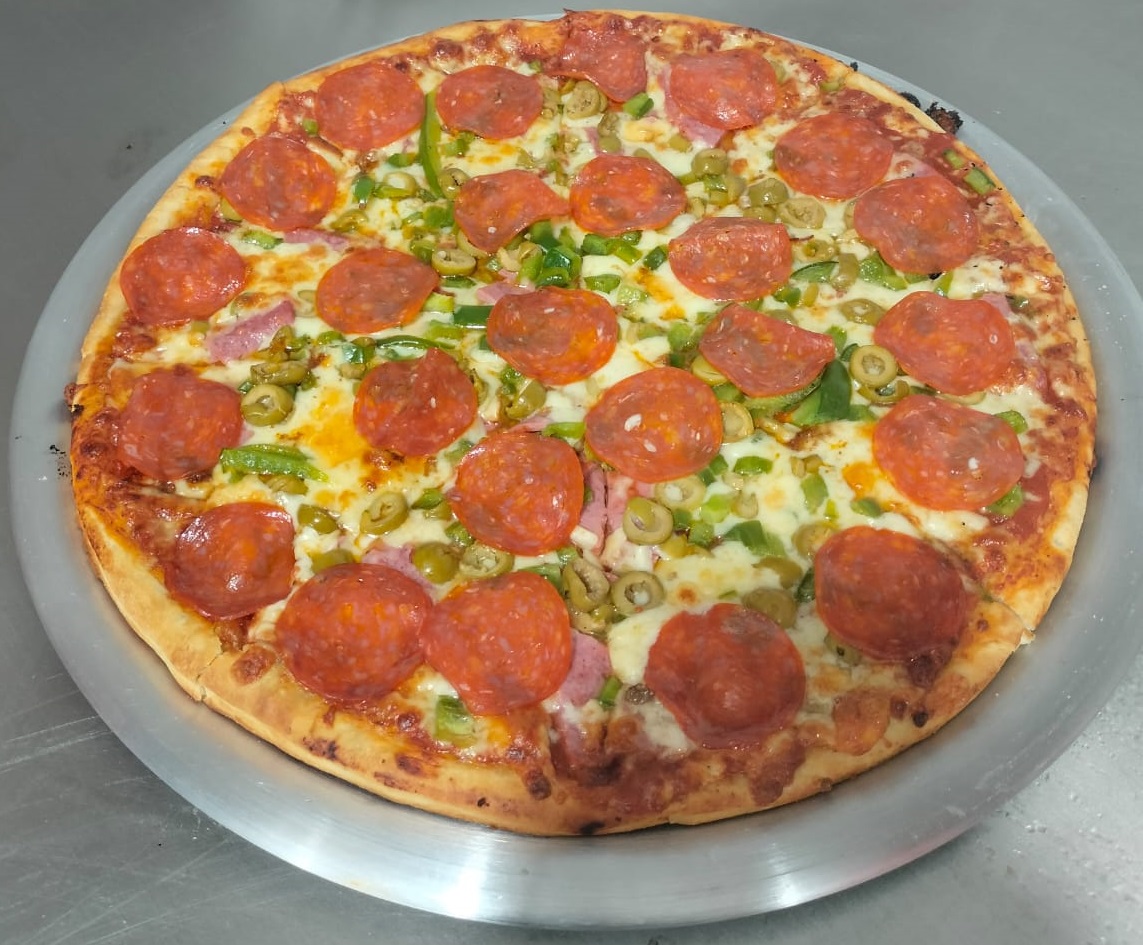 Deliciosa masa para pizza preparada artesanalmente con salsa de jitomate y queso acompañada de pepperoni, salami, pimiento verde y aceituna verde.
