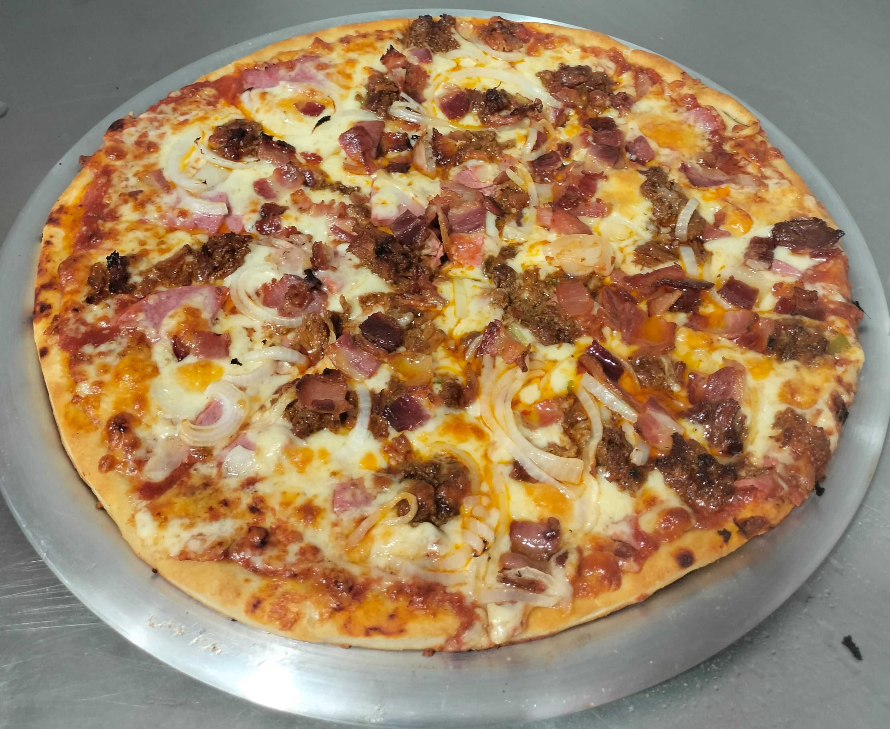 Deliciosa masa para pizza preparada artesanalmente con salsa de jitomate y queso acompañada de salami, chilorio, tocino y cebolla