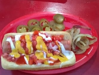 Dos salchichas, camarón, queso, jamón y papas.